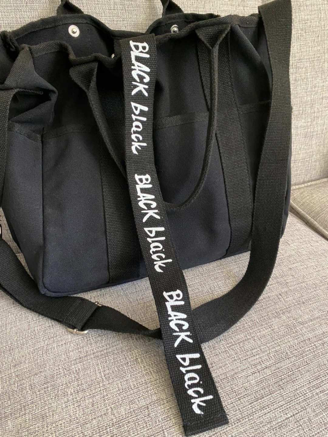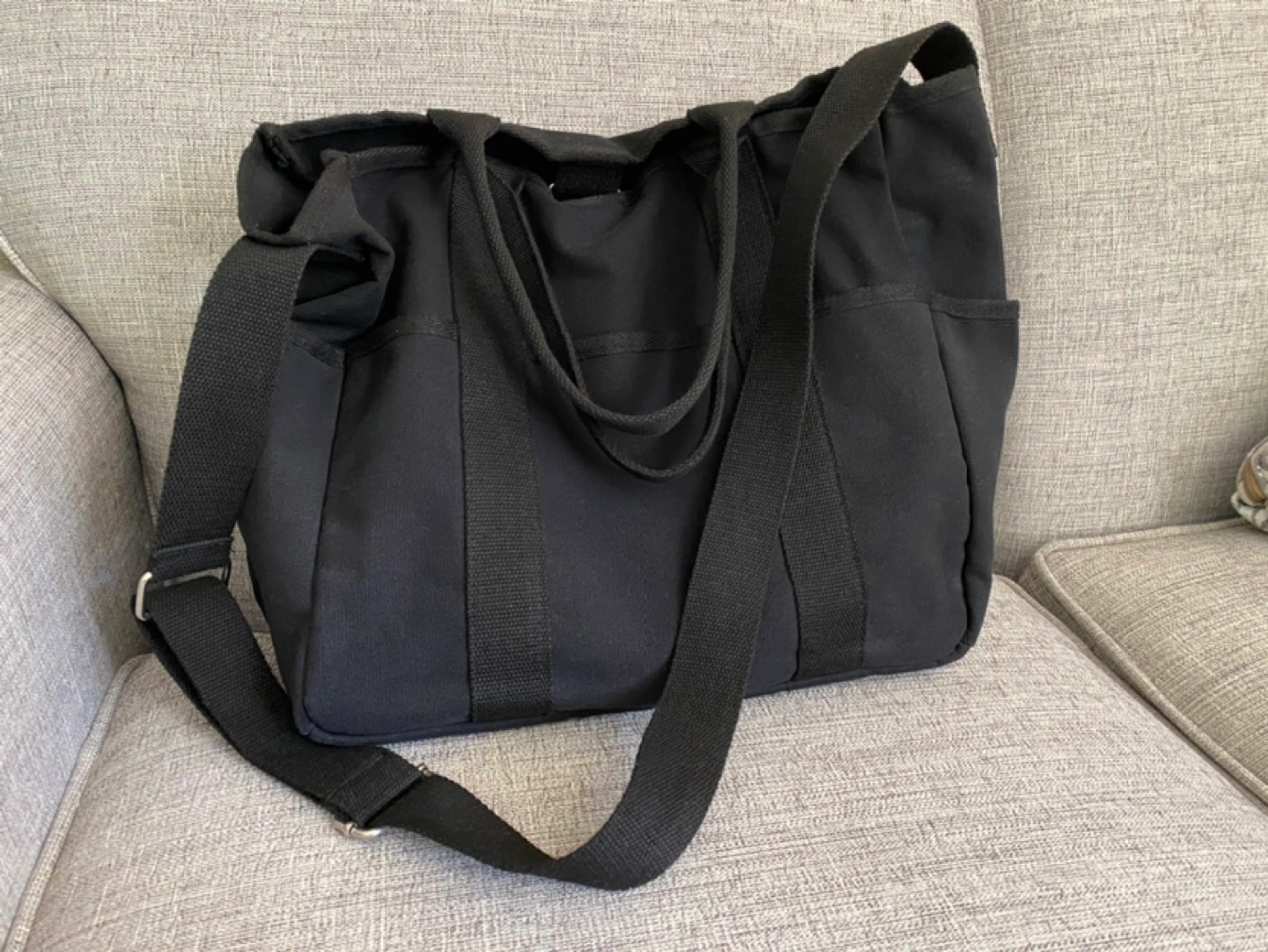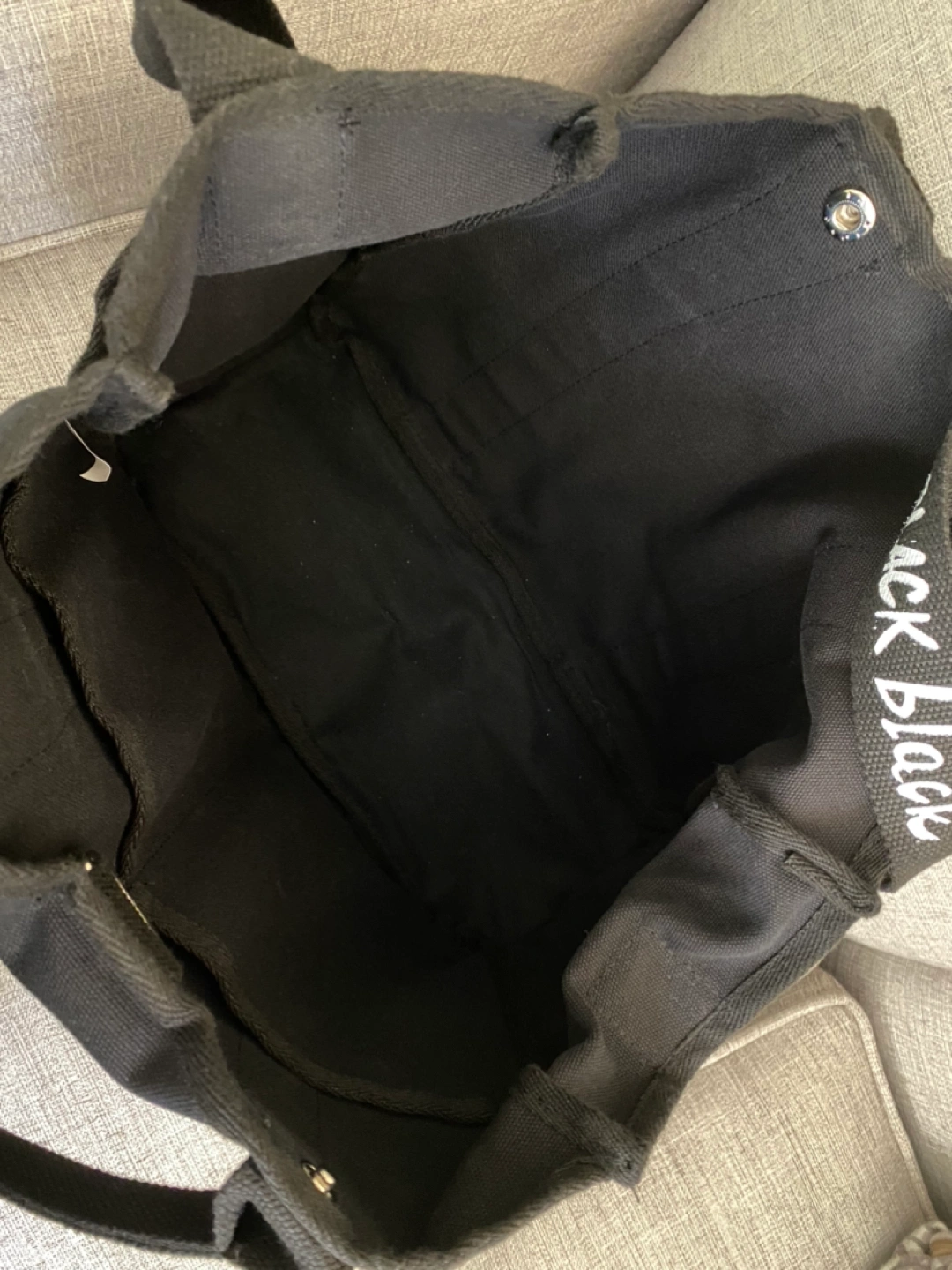 very roomy and has two interior pockets, great condition. it has a strap with writing on it, but that can be cut off if not wanted or kept tucked inside.