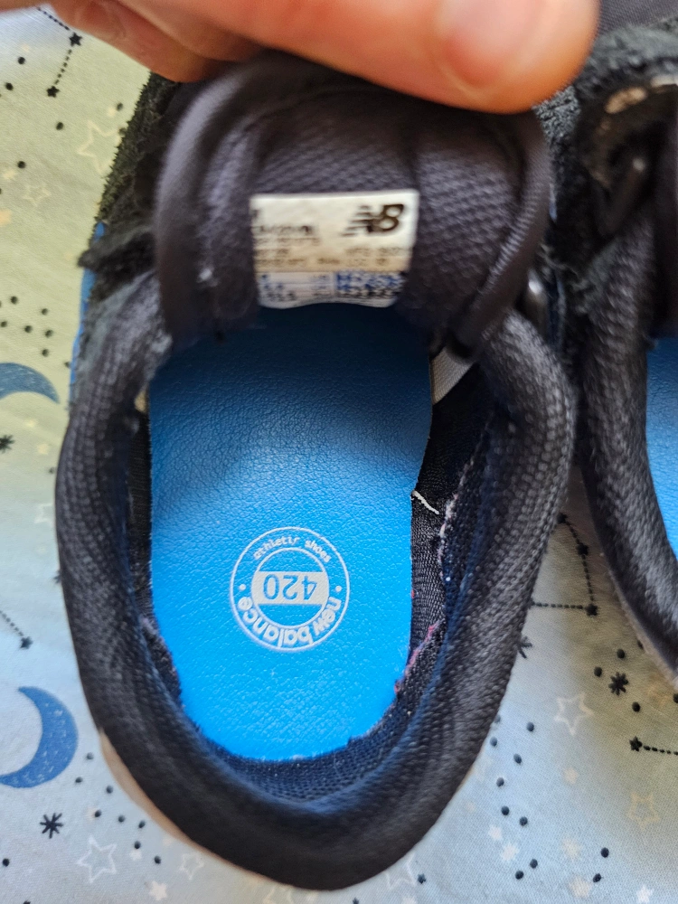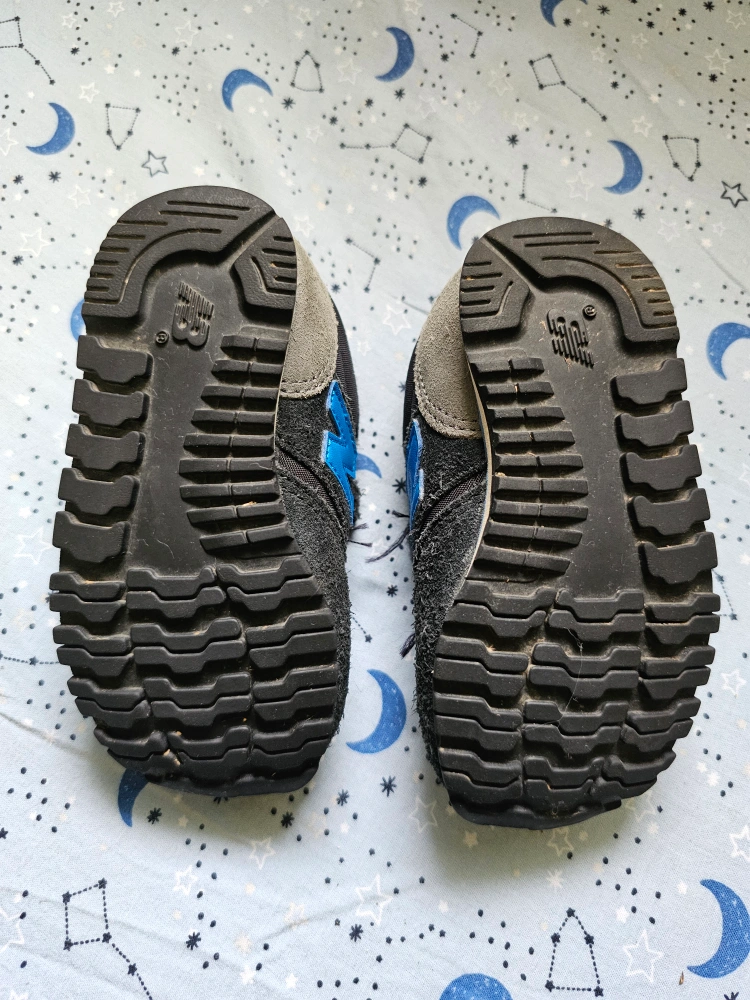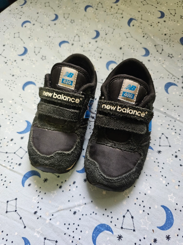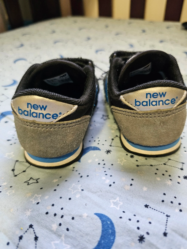 294Black and grey suede toddler shoes. Blue accents. Velcro closure.