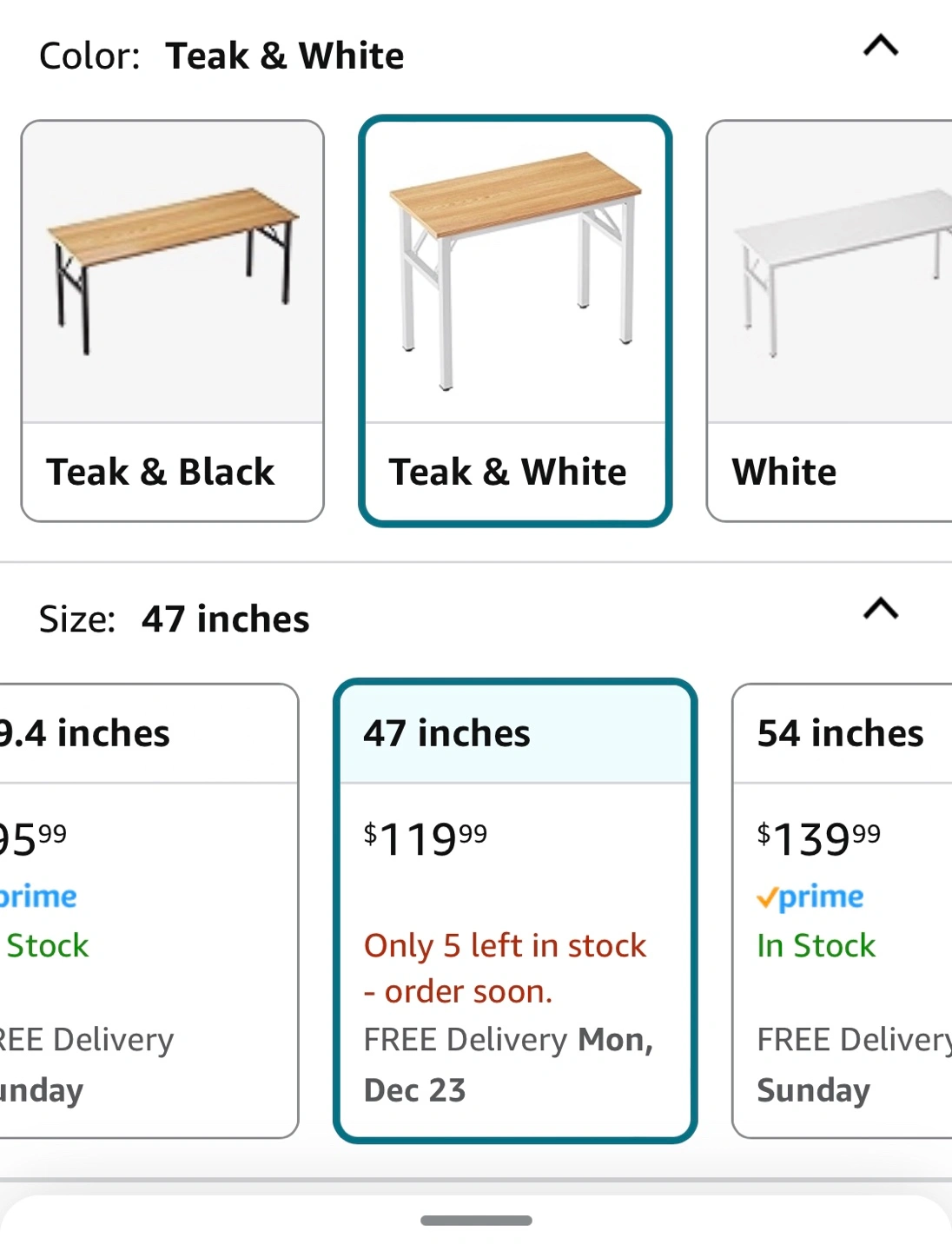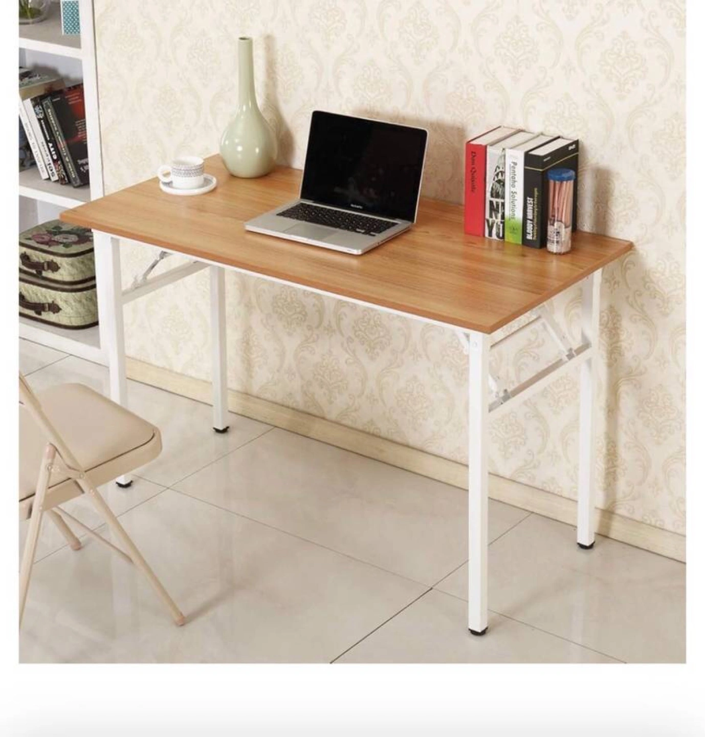 This teak and white desk can be folded flat for storage by folding the legs underneath. Very sturdy. Very cute.