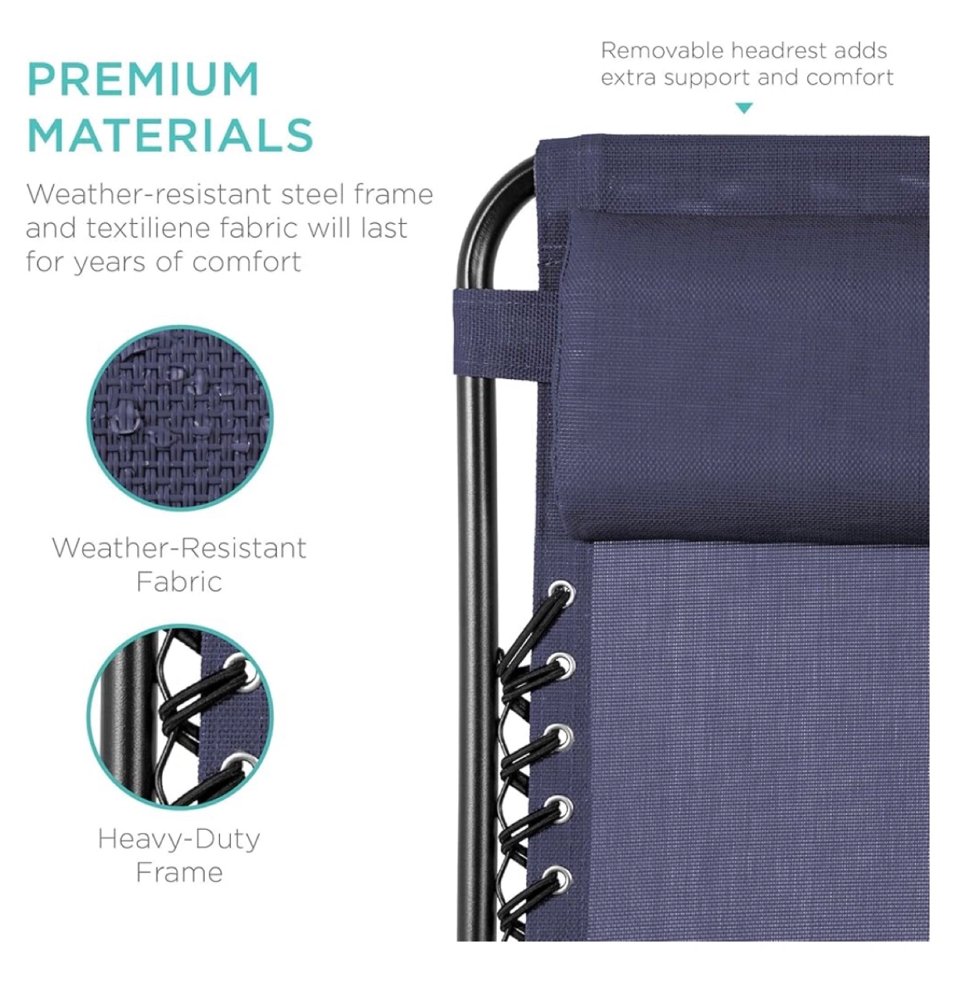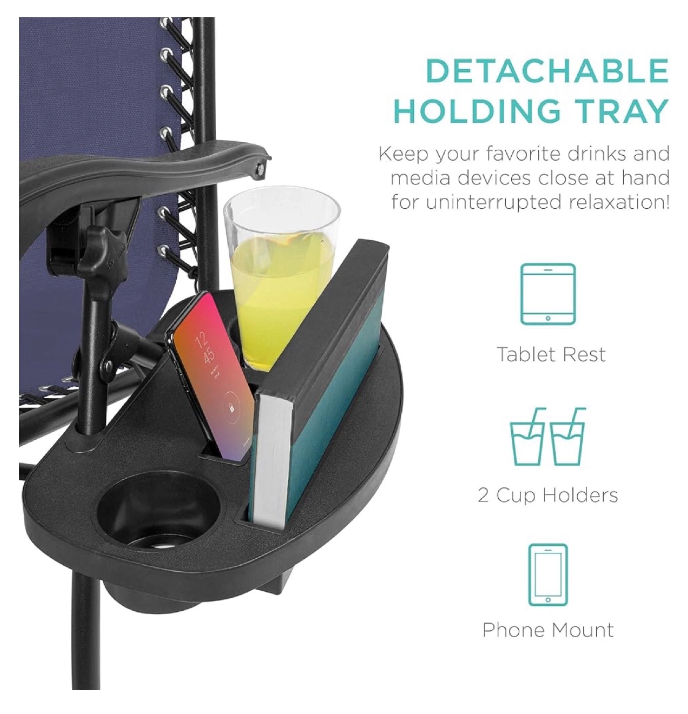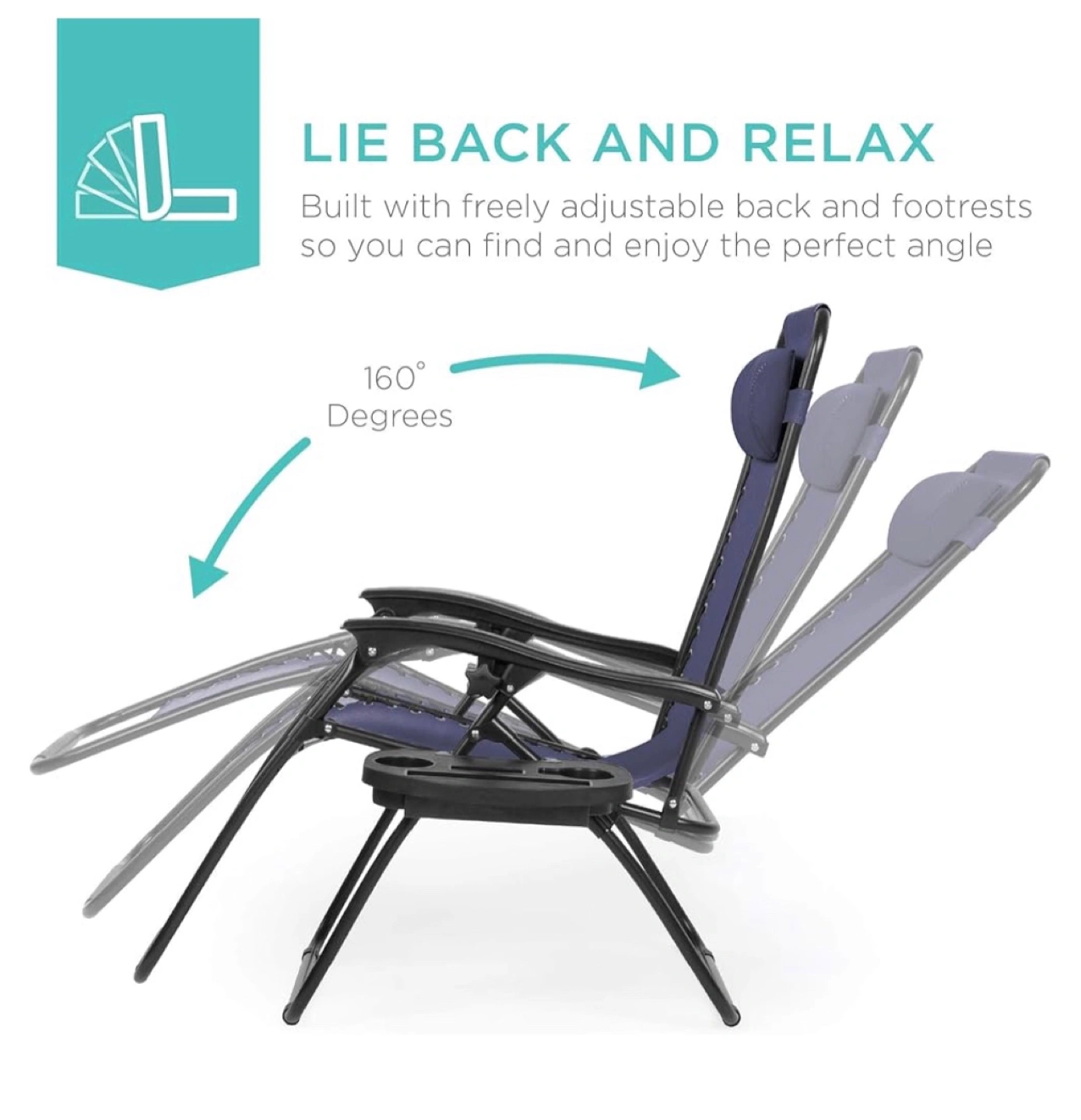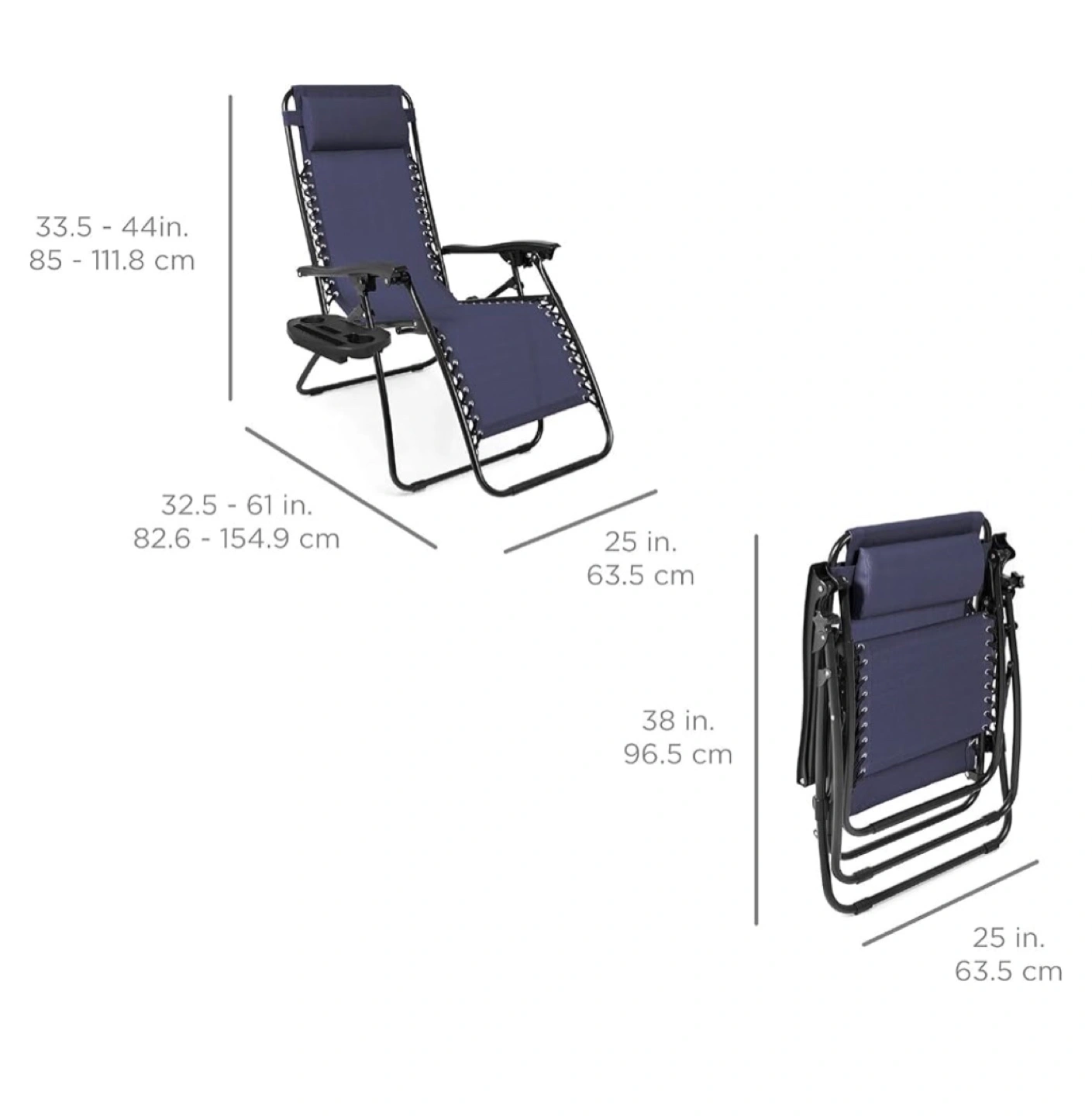 Folding zero gravity beach lounge chair with headrest and adjustable positions. Blue mesh material and black steel frame. It also has a tray for drinks, phones and tablets. Added two padded arm rests to make it more comfortable.