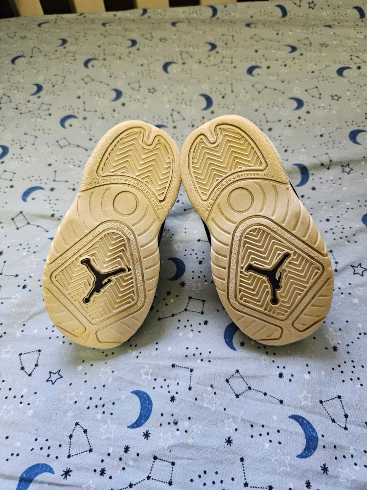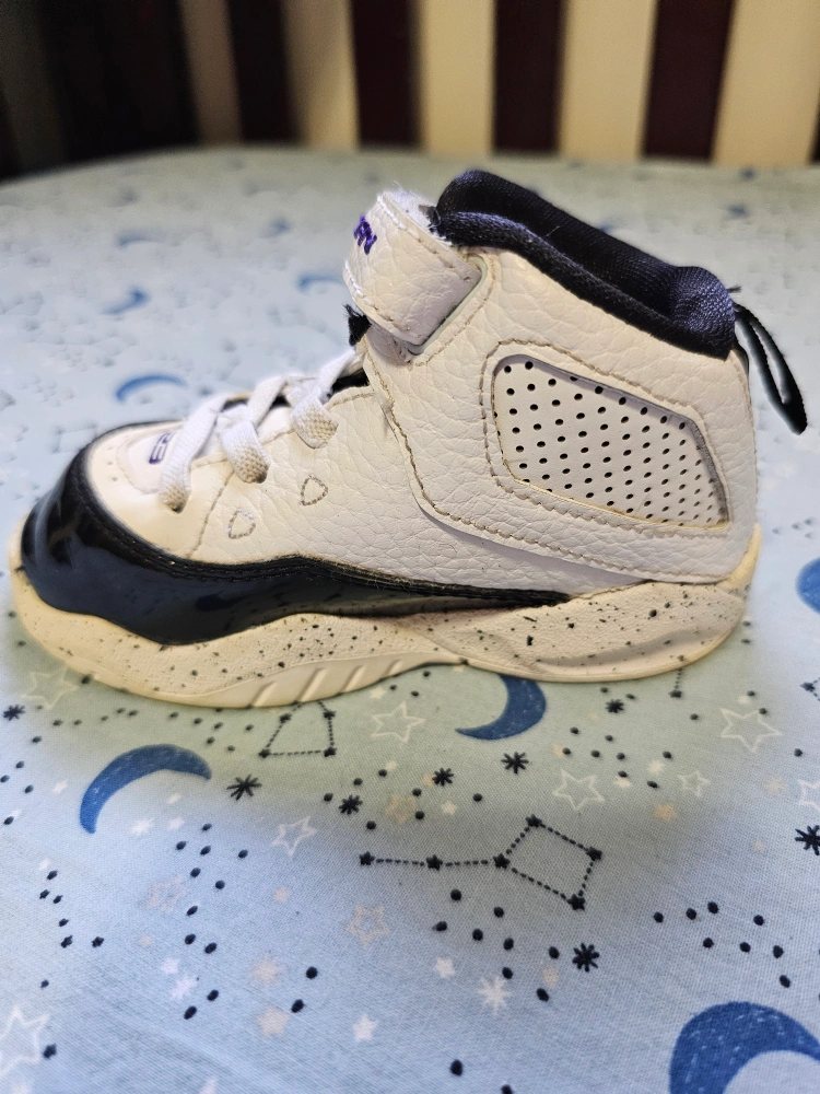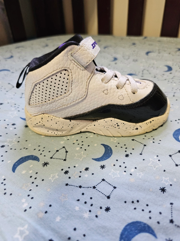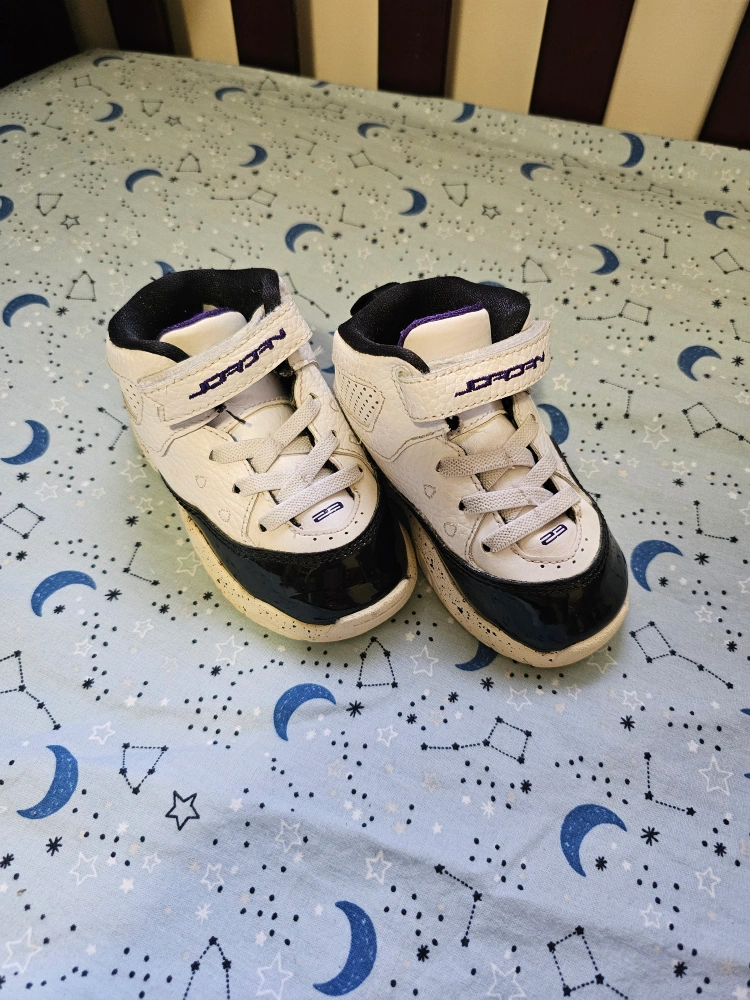 294White and black Jordan baby shoes with purple accents. Elastic fixed laces and a strong velcro strap. Used for indoor play. No box available. Keep your little one strong and steady as they walk and run around the house!! Doesn't hurt that these shoes are also super cute 😍 P.S. Discounts offered with multiple purchases