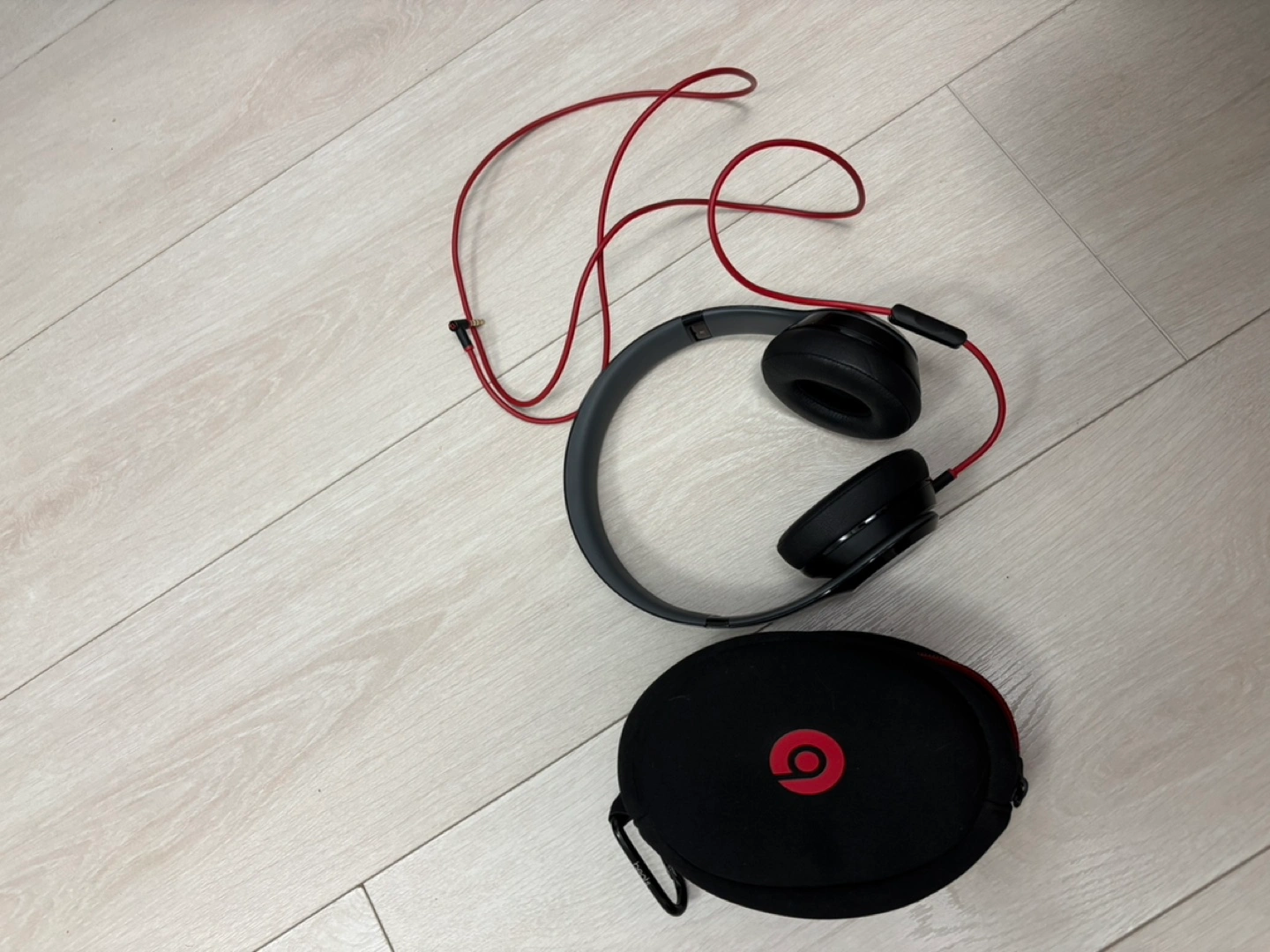 Black on-ear headphones with red accents. Includes carrying case and cable. Retails for $200+. I barely used these so they are in great condition