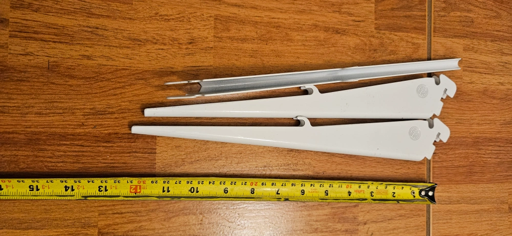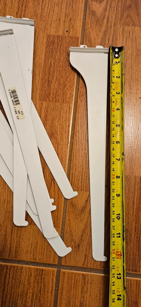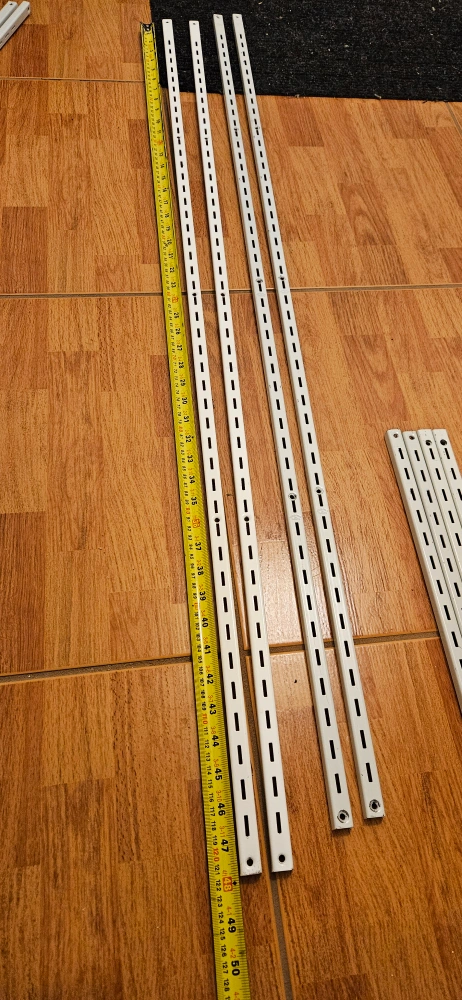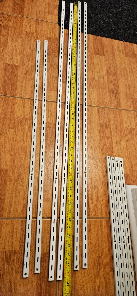 Set of shelves, brackets and rails. Good condition. White metal. Rails 4-48", 2-36 " 2- 24", 8- white brackets10" , 6 differently kind of brackets