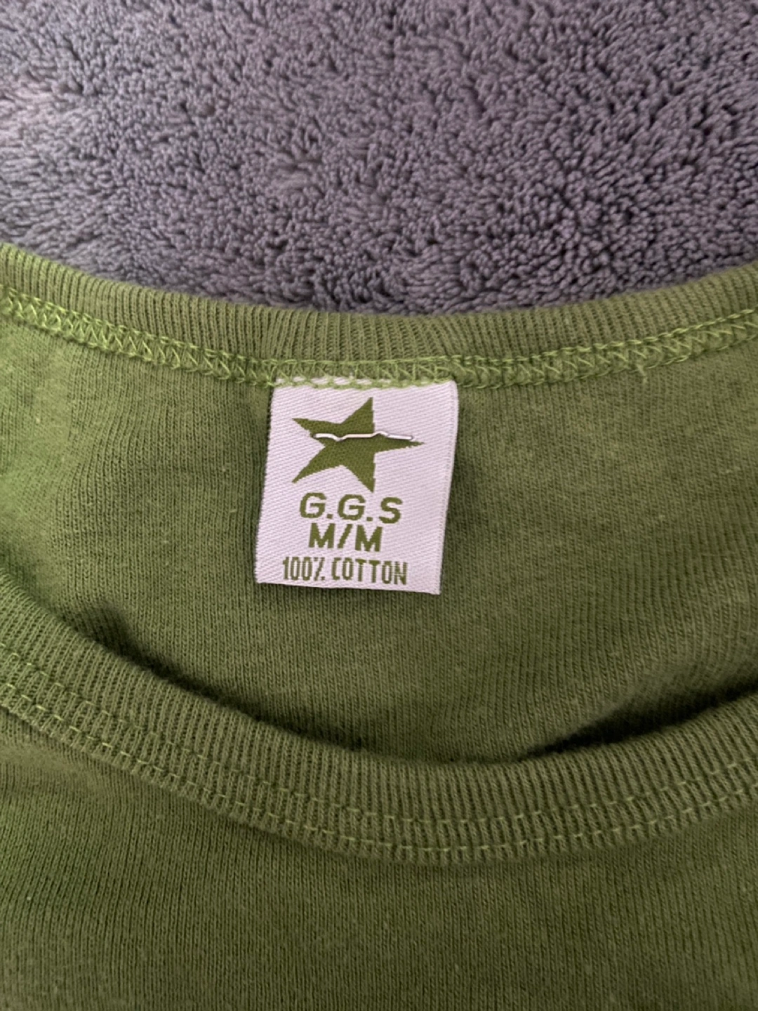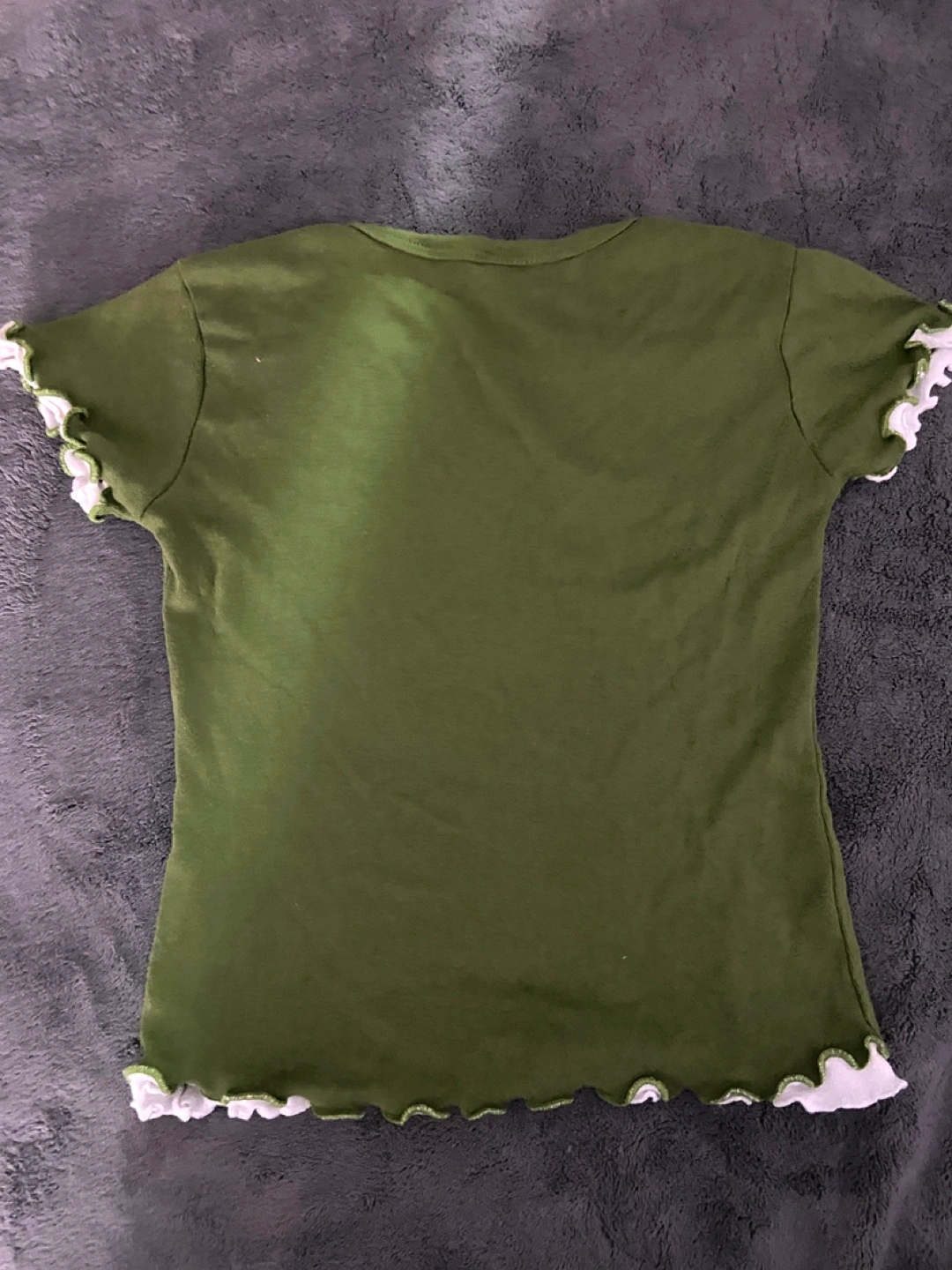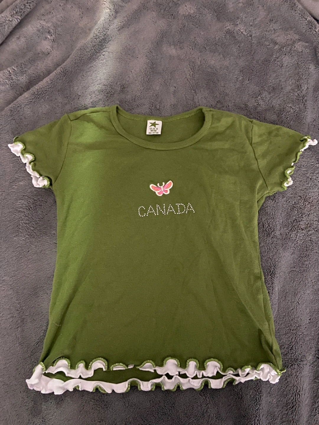 Green short-sleeved t-shirt with a white ruffled trim. Features a butterfly and "CANADA" written in rhinestones.