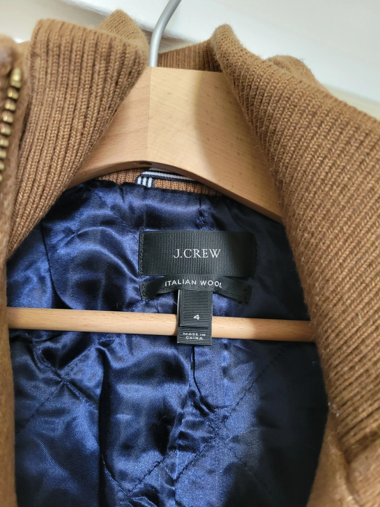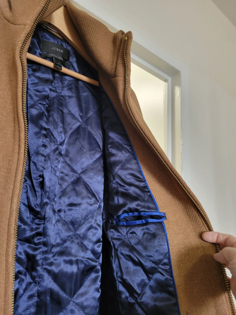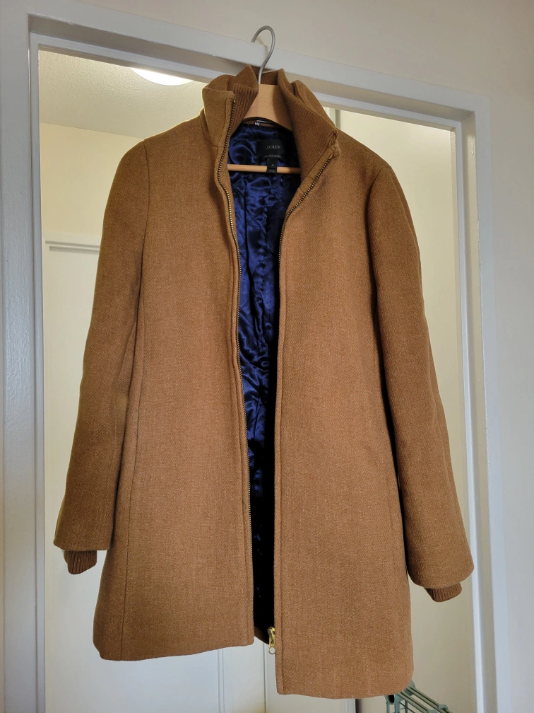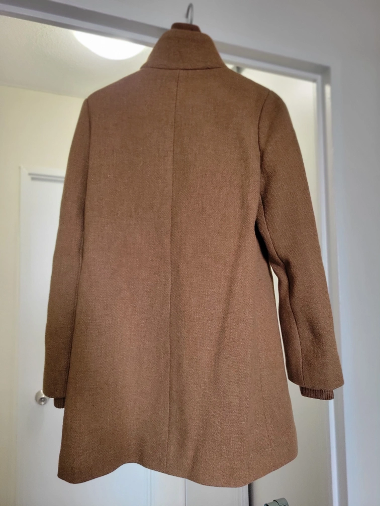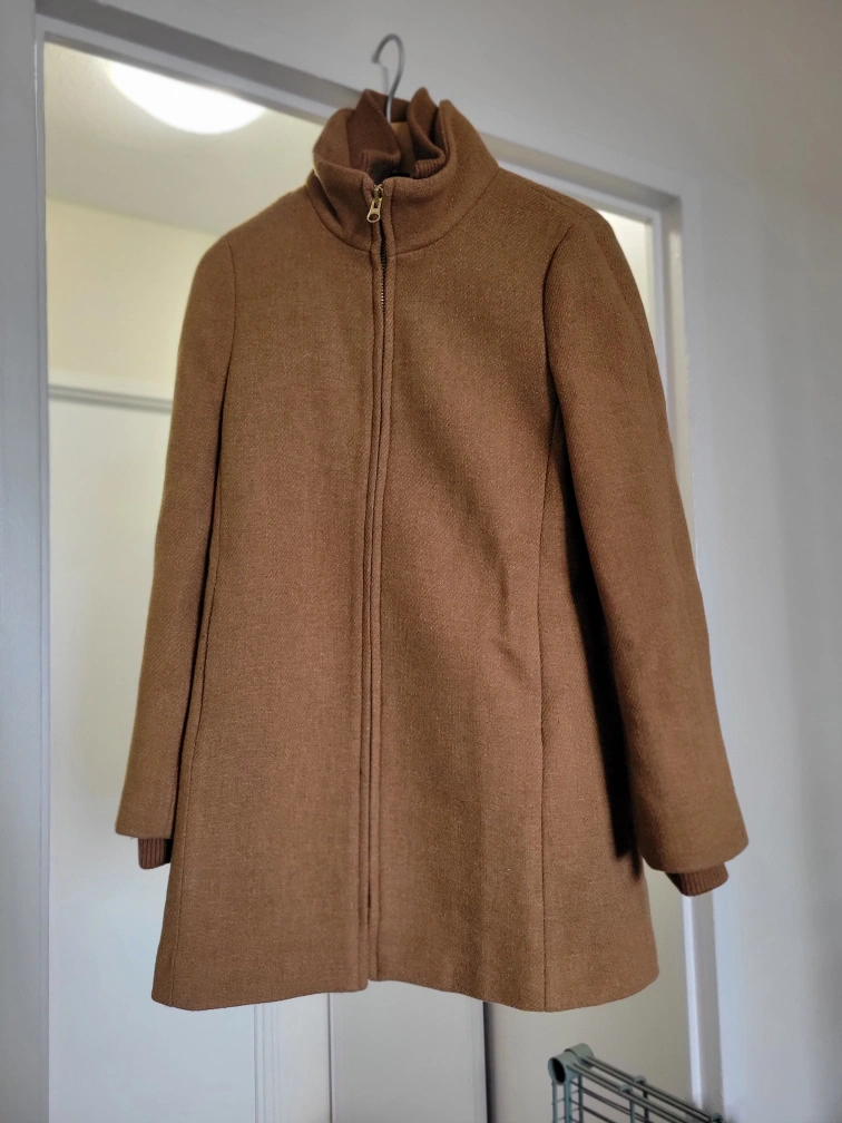 Light brown Italian wool coat featuring a zip closure and a high collar for a sleek look. It has a cozy quilted lining and has been gently worn only a few times. Labeled as size 4 but fits between sizes 4 and 8. it's really warm. :)