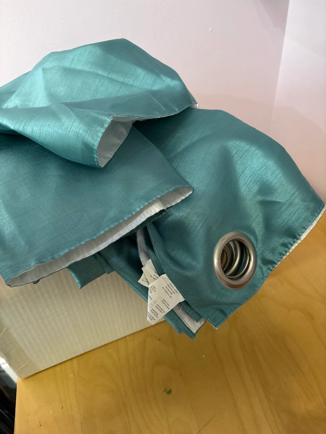 Teal room darkening curtains with grommets, double sided with light tone lavender gray in the opposite side. Light filtering, never been used.