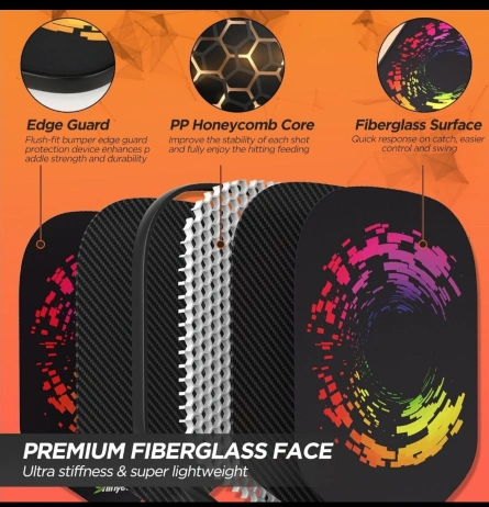 Pickleball paddle set with 3 balls and carrying case. Standard size with wide body and large sweet spot. Lightweight with fiberglass surface for quick response and control. Features a comfortable grip and a honeycomb core for enhanced stability. New Unopened