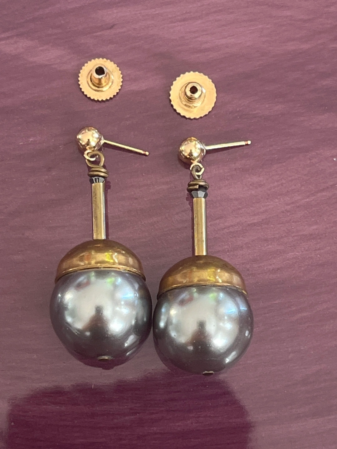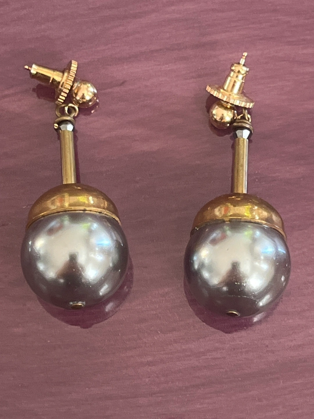 Large, grey/black pearl drop earrings in the style of Dior. Gold tone is brass metal