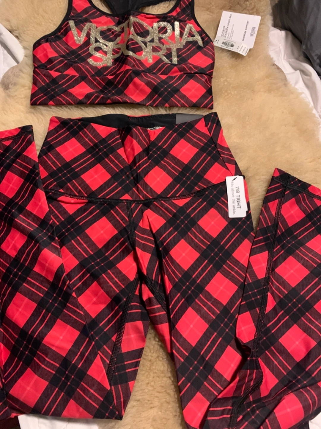 Red plaid leggings and matching sports bra. Size XS/XP. Leggings are 7/8 length and hit above the ankle. New with tags.