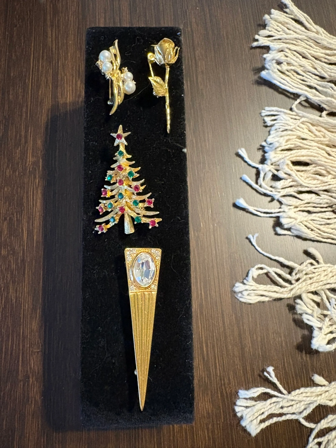 Set of 4 vintage brooches. One is a Christmas tree, another is a rose, one with pearl accents and one shaped like a triangle. All are gold-toned.