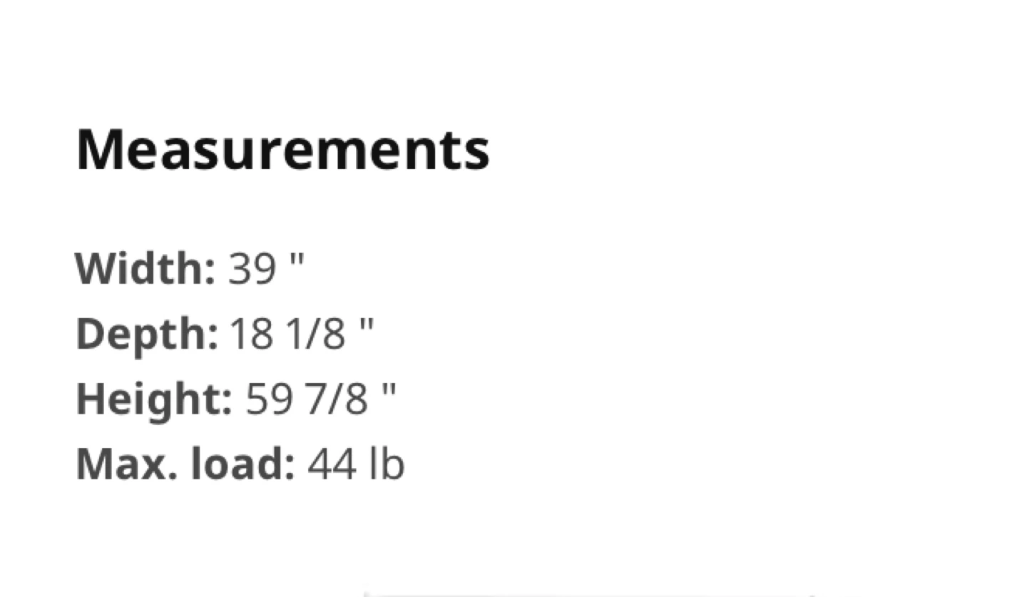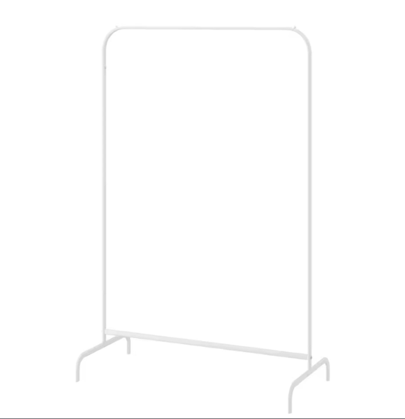 White clothing rack with a single rod. Measures 39 inches wide, 18 1/8 inches deep, and 59 7/8 inches tall. Can hold up to 44 lb.