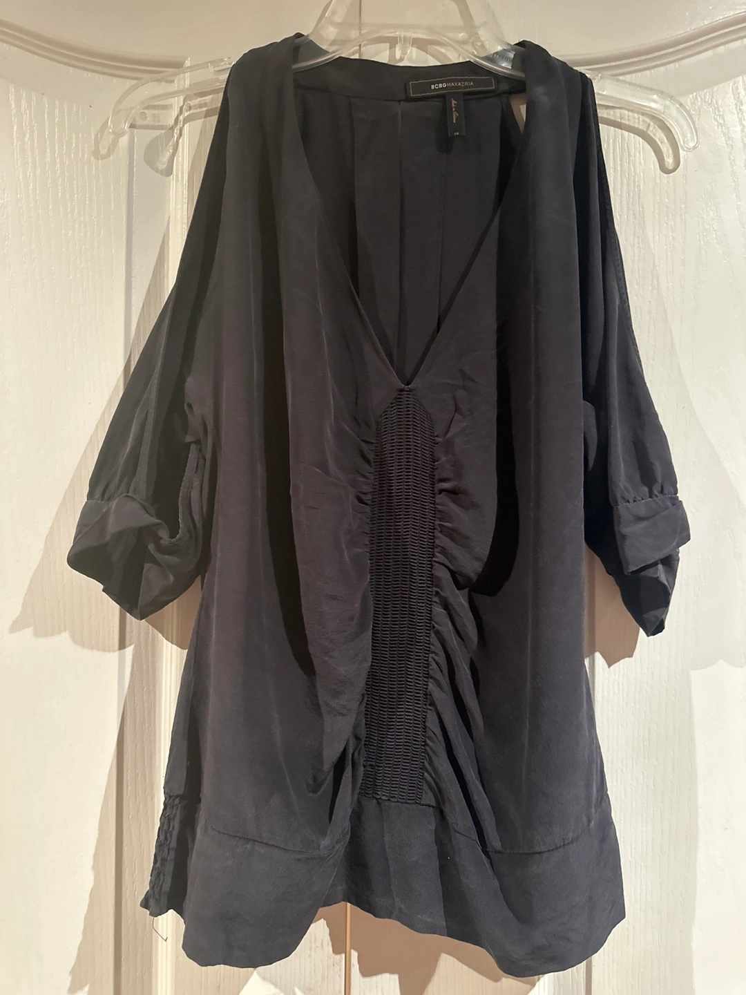 Black cold shoulder blouse with a v-neck. Made of a soft, silky material. Short sleeves with elastic cuffs.