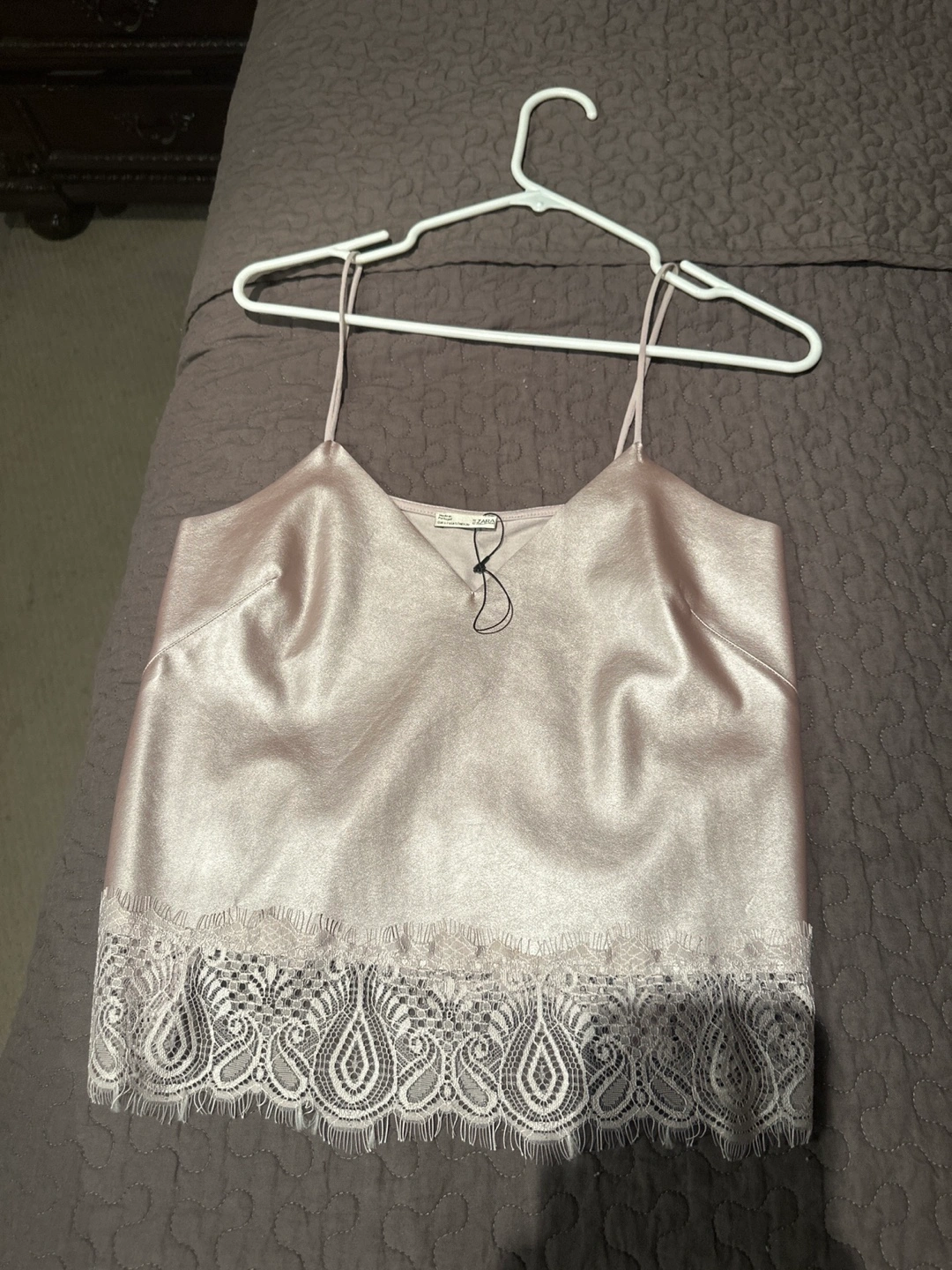 515Satin top with lace trim. Strapless and cropped. Size S. Got it as a gift ! Never worn !