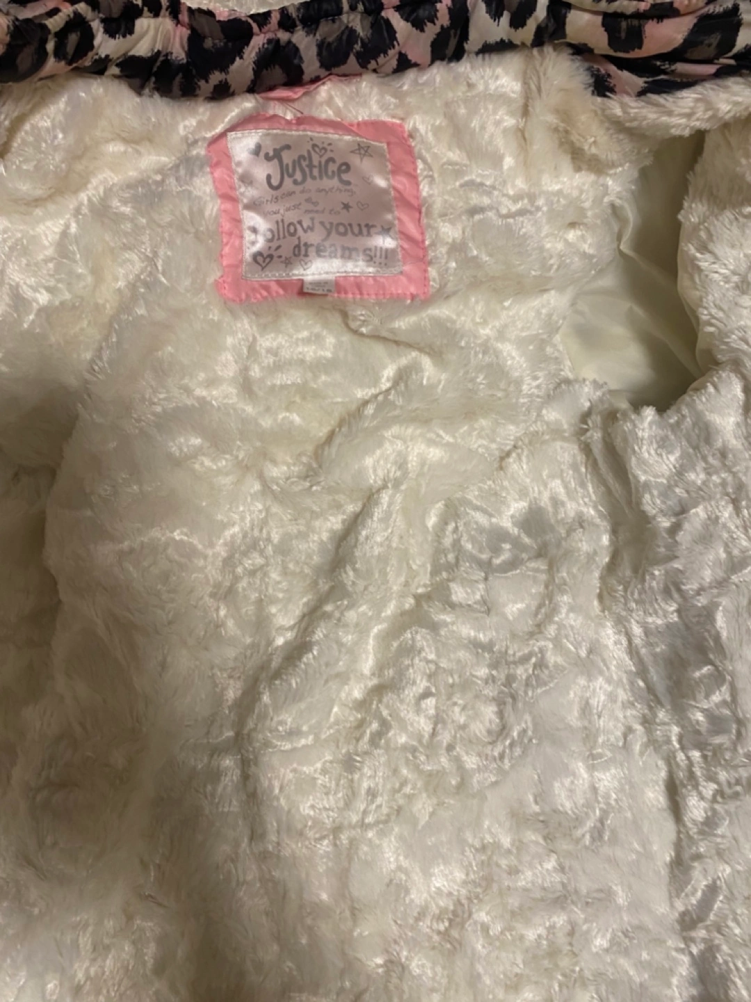 Justice Pink and black leopard print jacket with a fur-lined hood. The jacket is fully lined with white faux fur. Size 16/18.