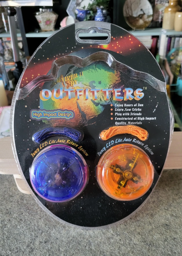70Two pk Yo-Yos with LED lights and auto return system. One yo-yo is orange, the other is purple. High impact design. Clip to hang on belt, so can be available to show off your skills anytime! Great fun for all ages! All Sales Final, No Returns. Cash only please.