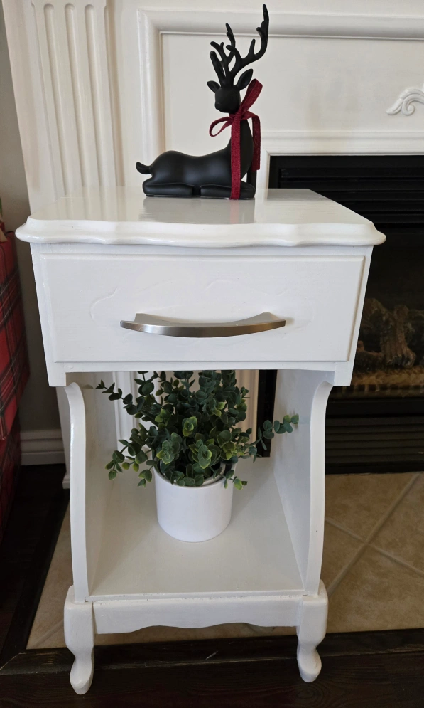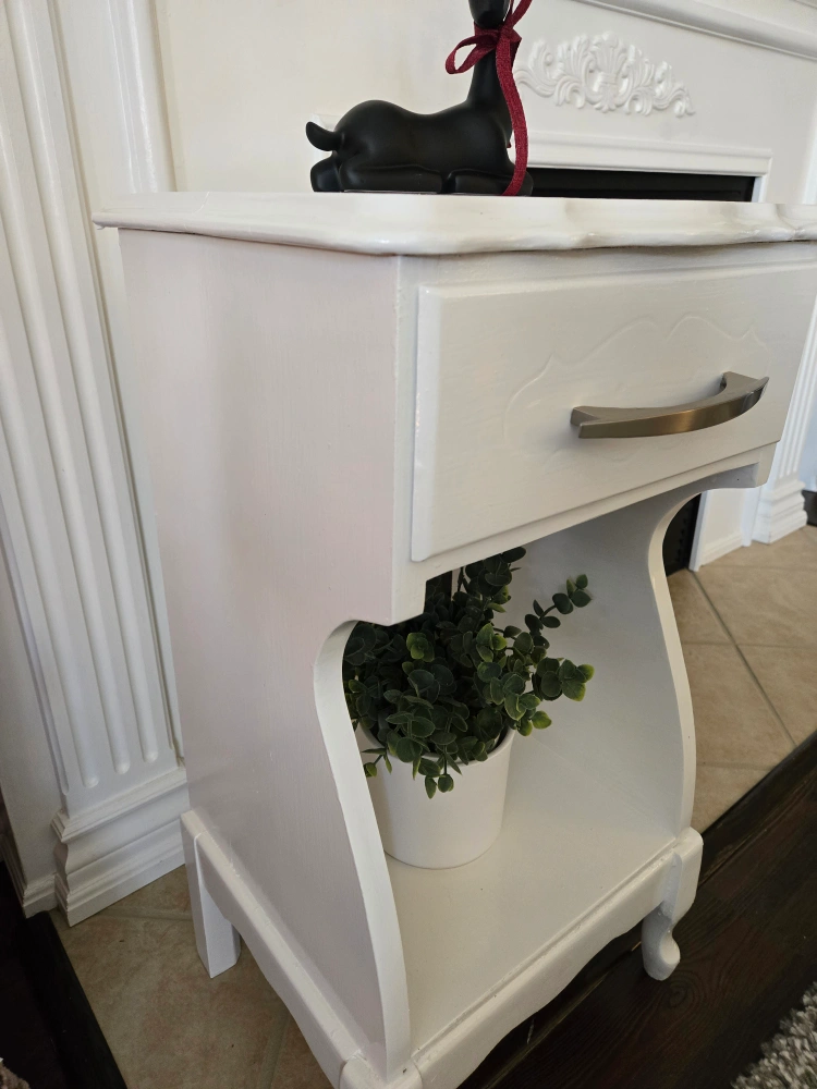 White nightstand with a single drawer and shelf. It has a curved top and is in good condition. 14 1/2" wide x 12 1/2" deep x 27 1/4" high, smoke free home, pick up Franklin and Saginaw area of Cambridge.