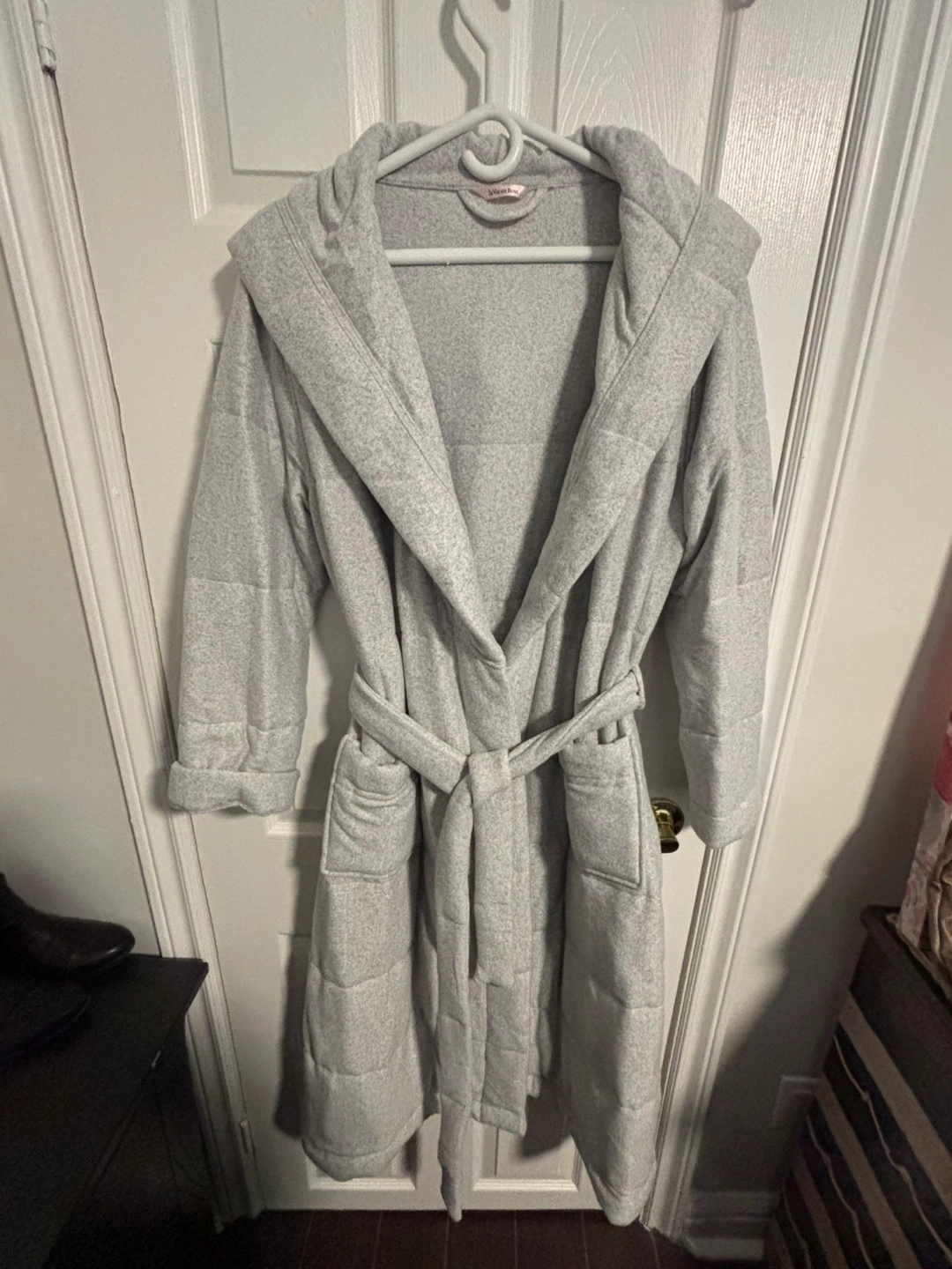 Grey fleece robe with a hood and tie belt. Long sleeves. Never worn. Heavy and very warm.