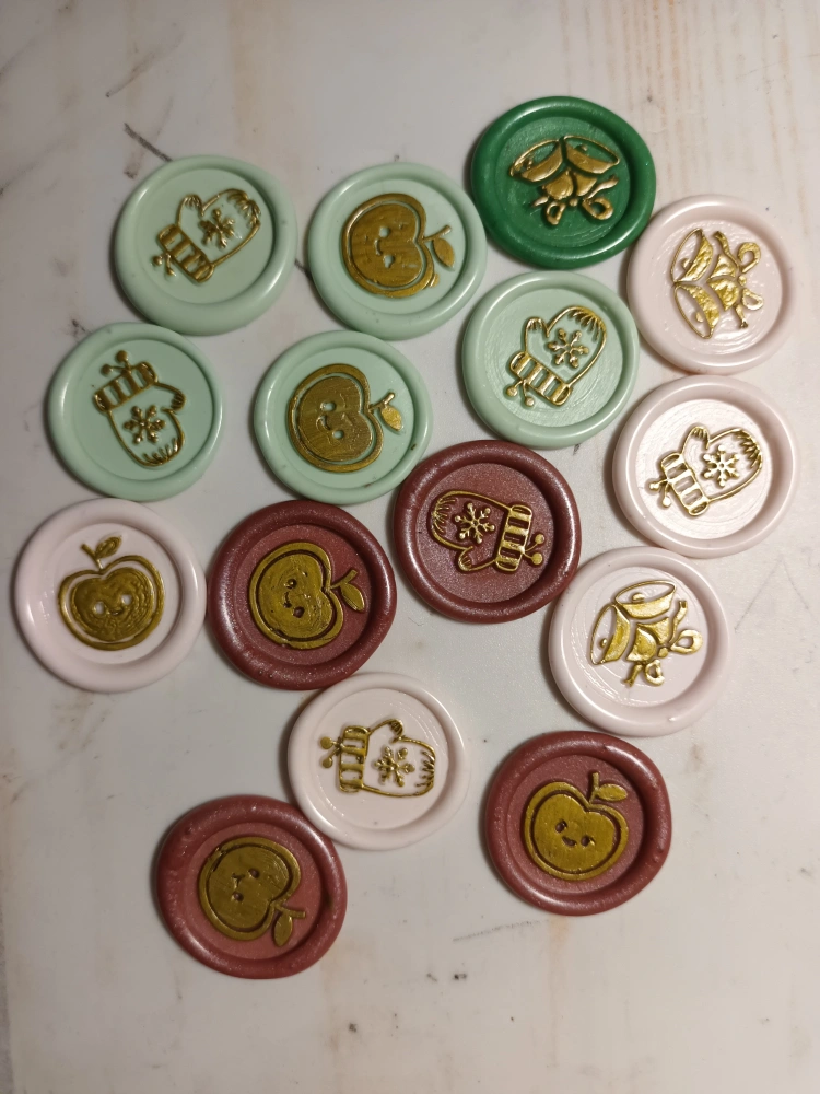 Set of wax seals (15) with various Christmas designs. Includes apples, mittens, and bells. Gold accents. Decorate your kids greeting cards, gifts with these self adhesive stickers. They are going to love it.