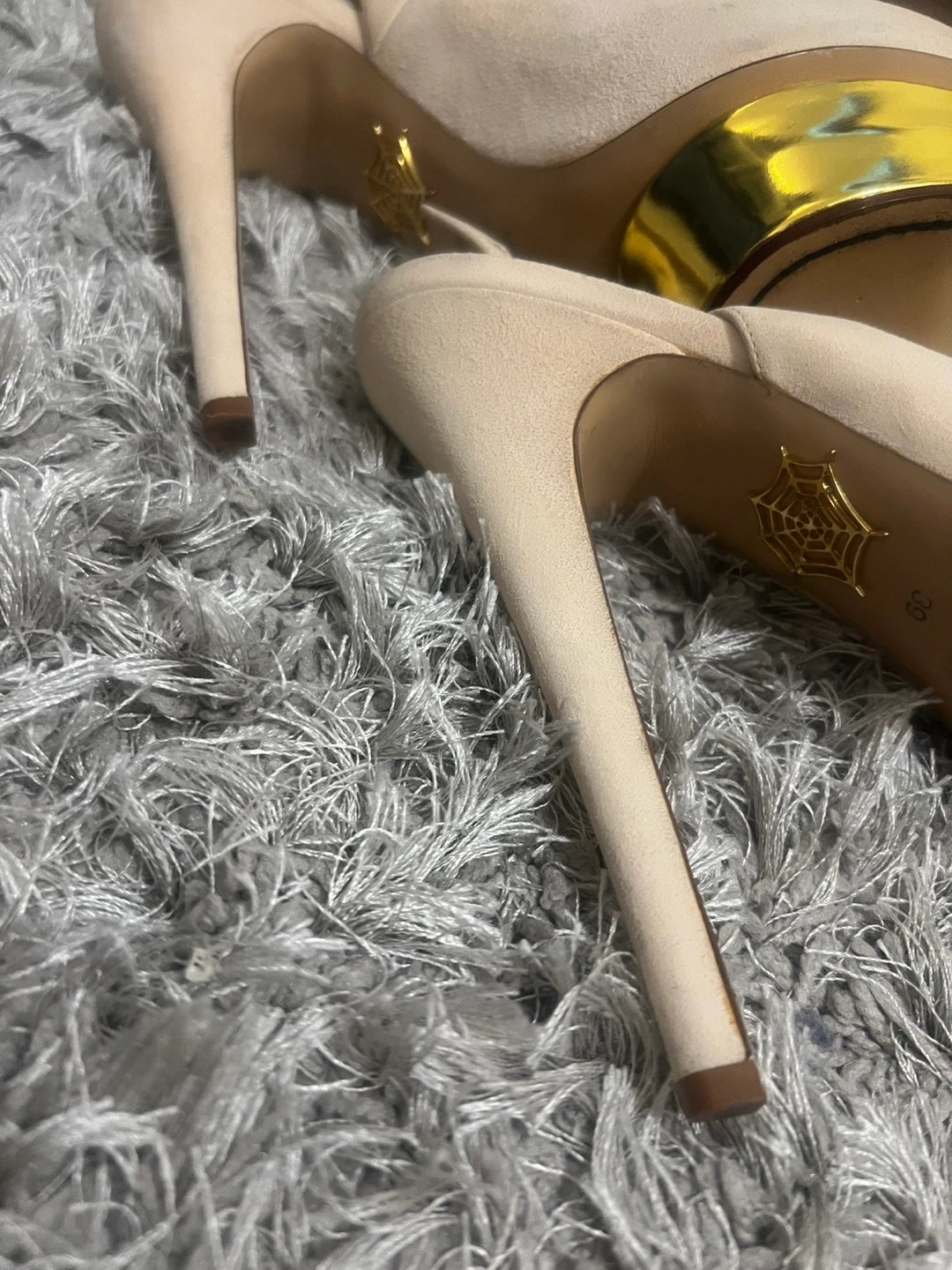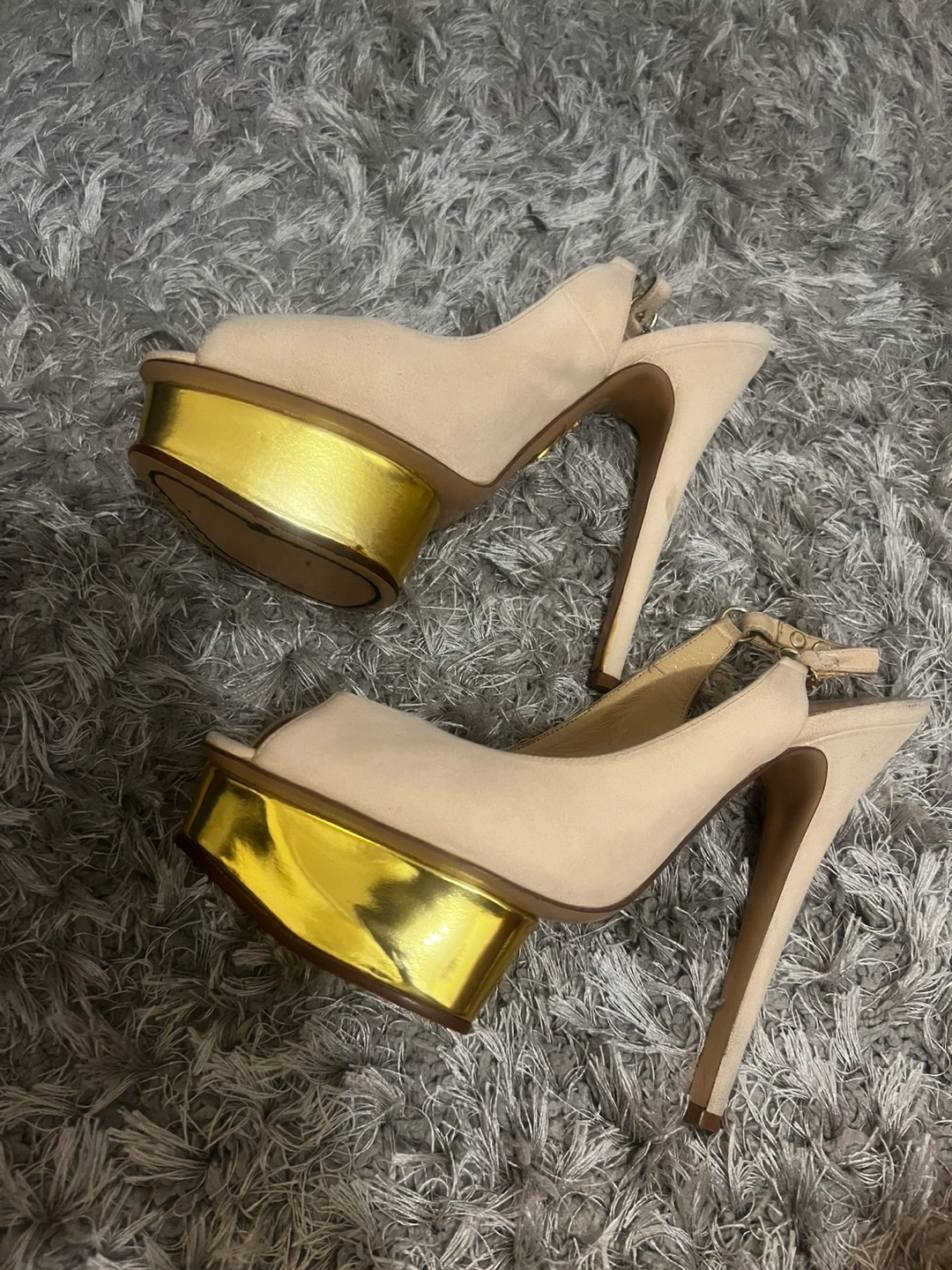 Nude colour platform heels with gold heels. The heel is 5 inches tall. The heels are in great condition and were once for a wedding then 2 times indoors for photo shoot. Very comfortable. Paid over $350 Negotiable!!! For serious buyers Ideal for parties, events, functions 🪅 Check out other listings for bundled deals and giveaways P/u Yorkdale or area