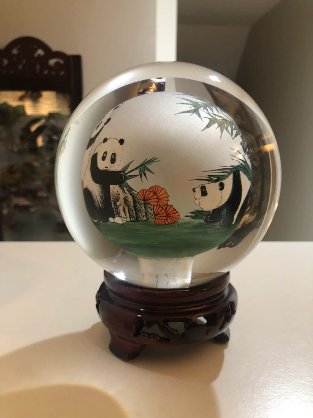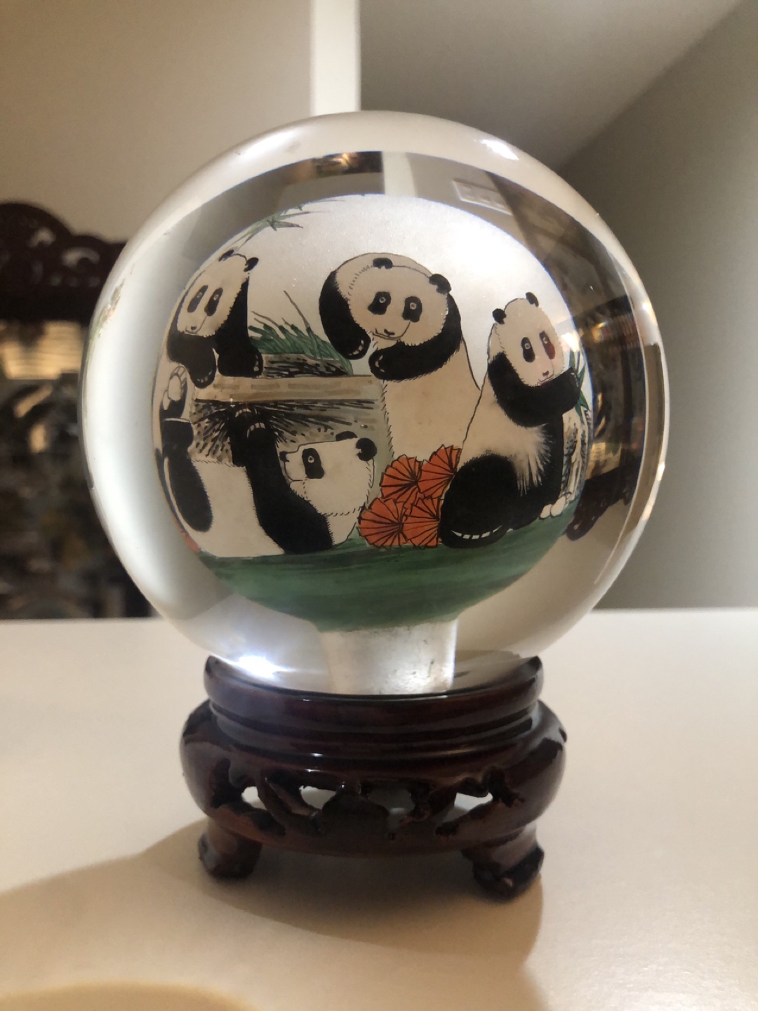 Rare glass ball with in-ward panda family painting. All handmade for the real panda lover.