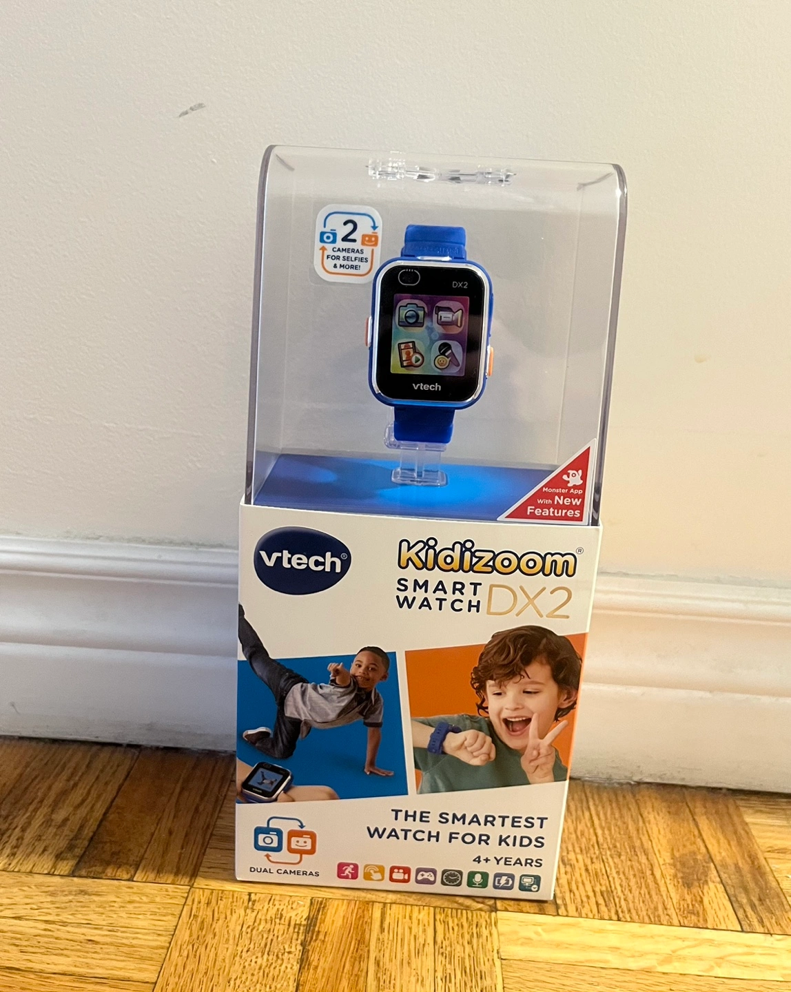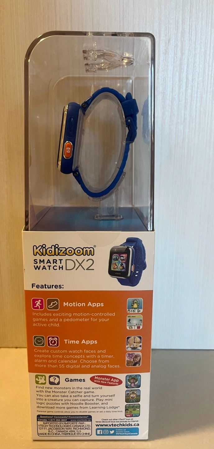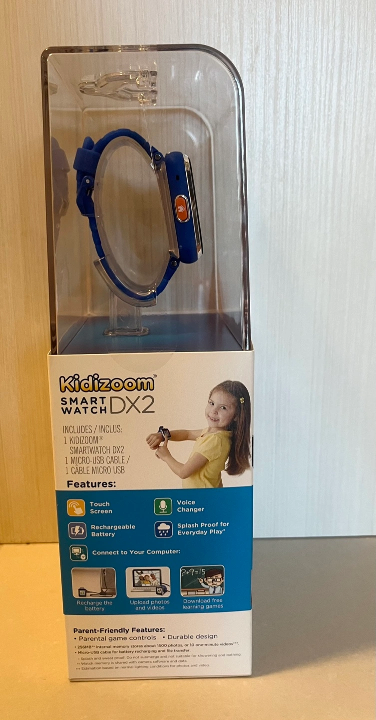 Kidizoom smartwatch with dual cameras, photo and video effects, motion apps, time apps, and games. Rechargeable battery. Connect to your computer to upload photos and videos. Includes a micro-USB cable.