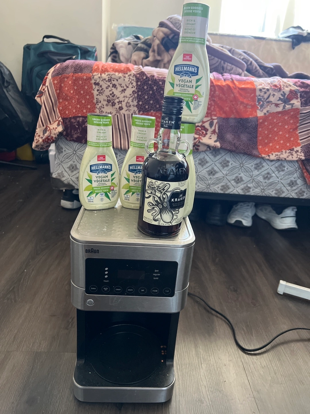 Bottle of Kraken rum and 3 bottles of Hellman's Vegan Vegatale dressing. All bottles are unopened. Plus the COFFEE MACHINE.