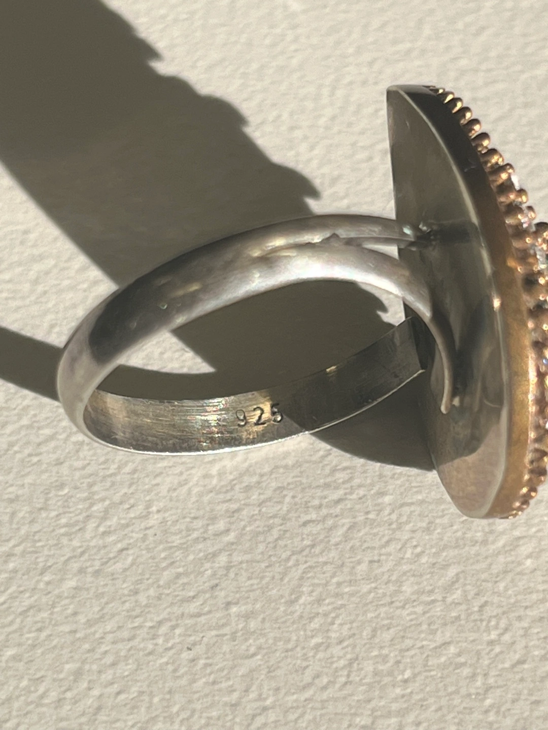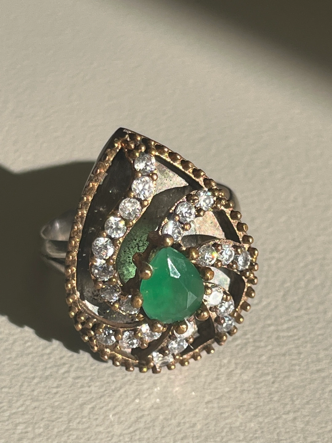 Sterling silver ring with a green stone, surrounded by clear stones. Rose gold base. Size 7.5