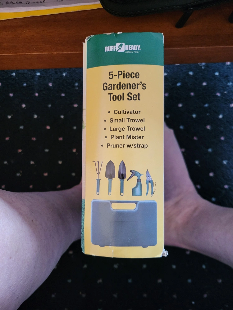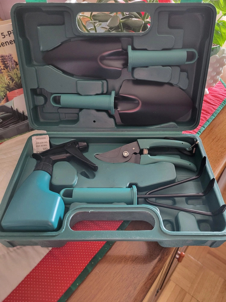 Includes cultivator, small trowel, large trowel, plant mister, and pruner with strap. Comes in a handy carrying case.