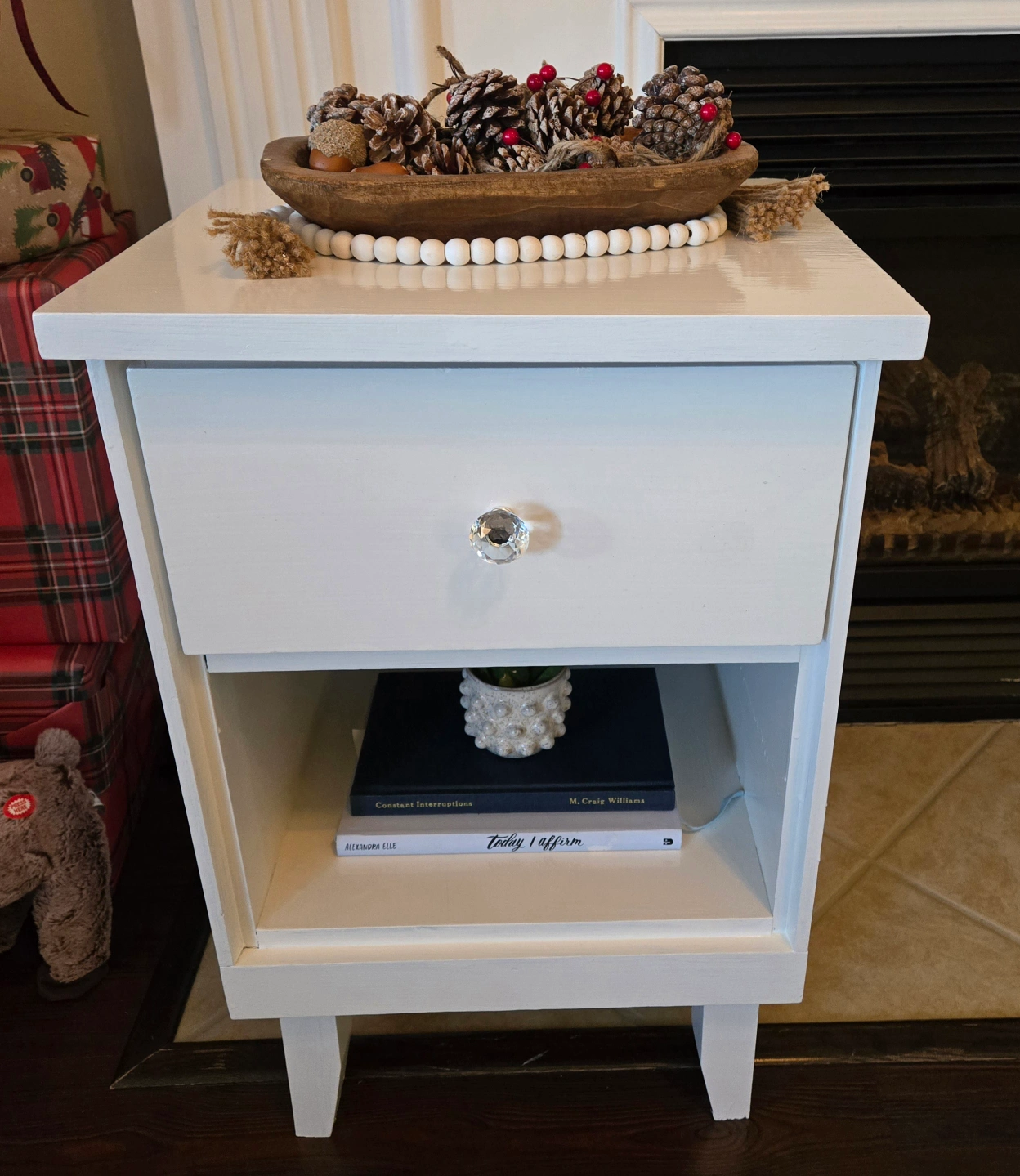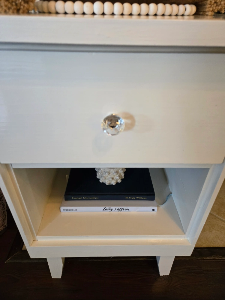 White nightstand with one drawer and one shelf. Crystal drawer knob. 16" wide x 14" deep x 25 1/2" high, smoke free home, pick up Franklin and Saginaw area of Cambridge.