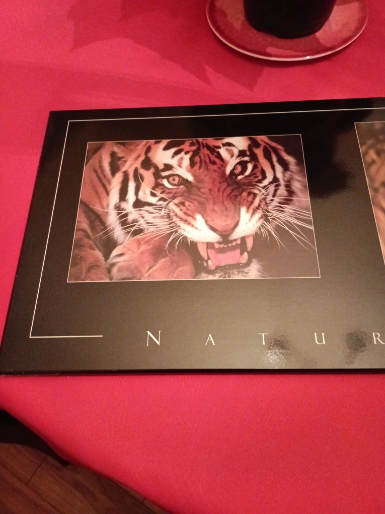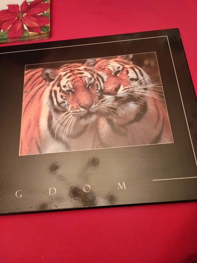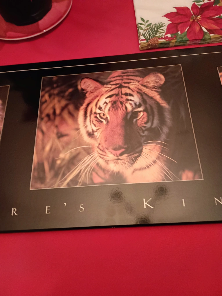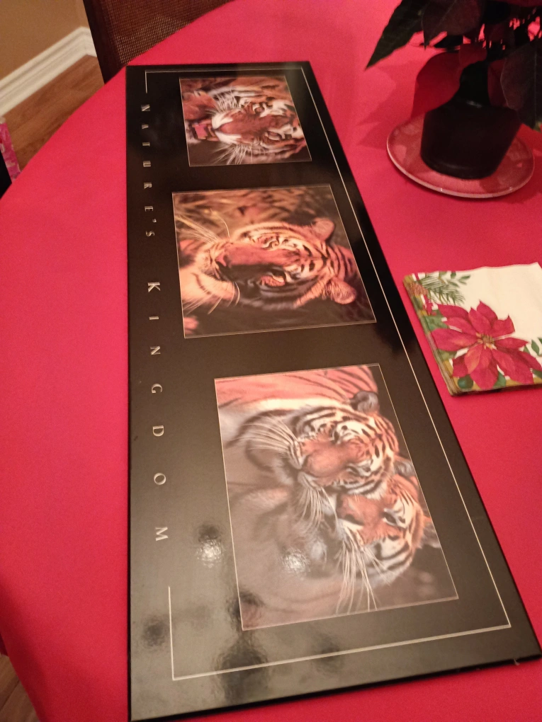 Wall art featuring three images of tigers. The piece is framed in black with a glass front. It has a hanging hook on the back.