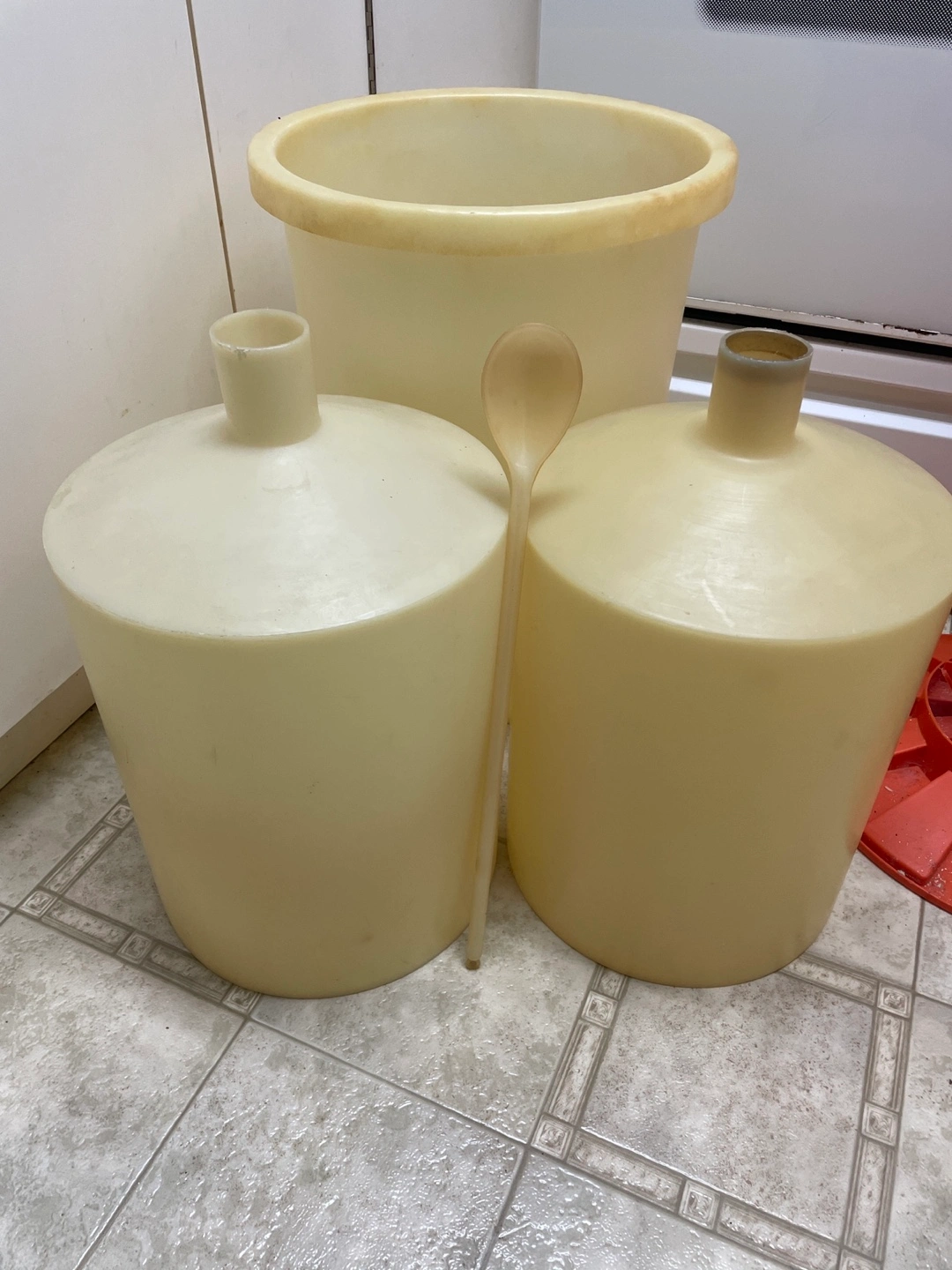 Three plastic fermentation crocks, one large mouth and two small mouth, with a long paddle for stirring. See other posting of wine making equipment for package deal