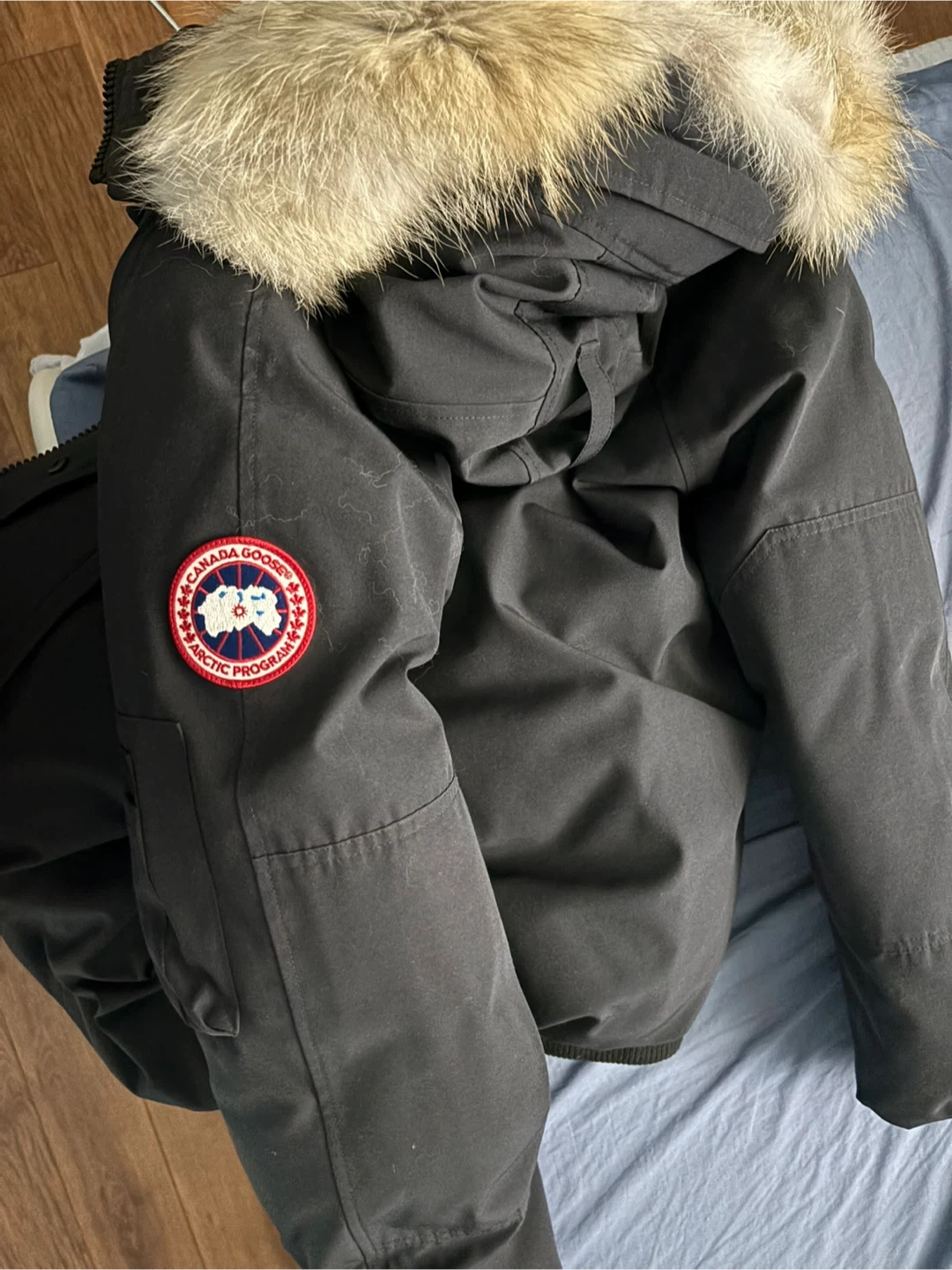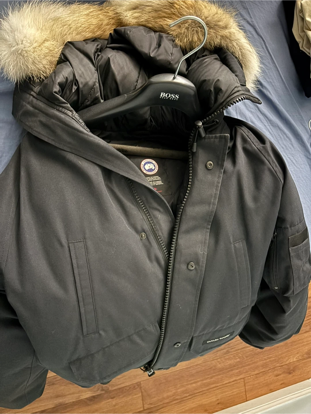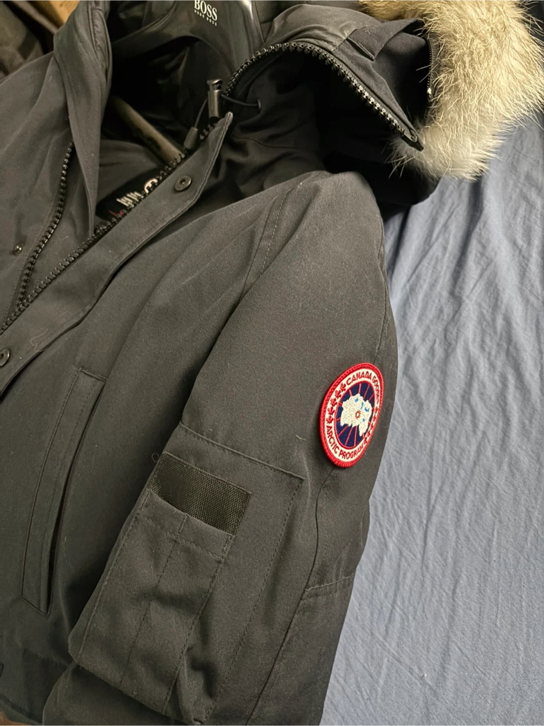 60Navy Blue Canada Goose Arctic Program Bomber Jacket with a fur-lined hood. Super warmth. Wrapped up and had been sitting in the cupboard. Brand new condition! Excellent for extreme cold winter and windy weather!