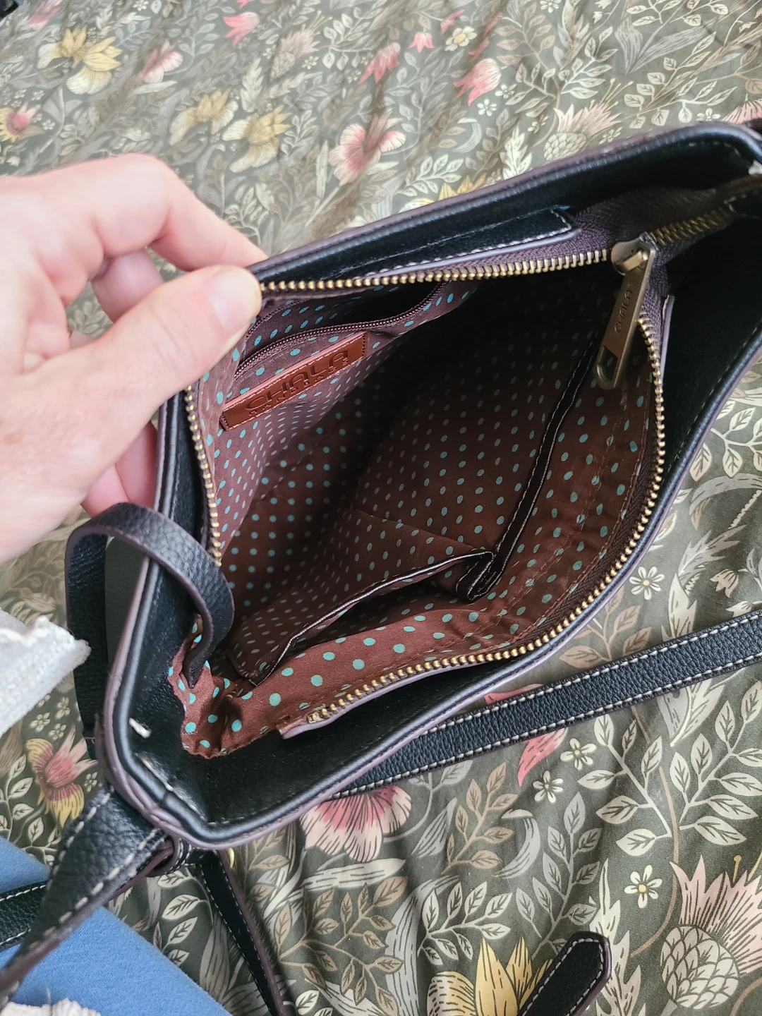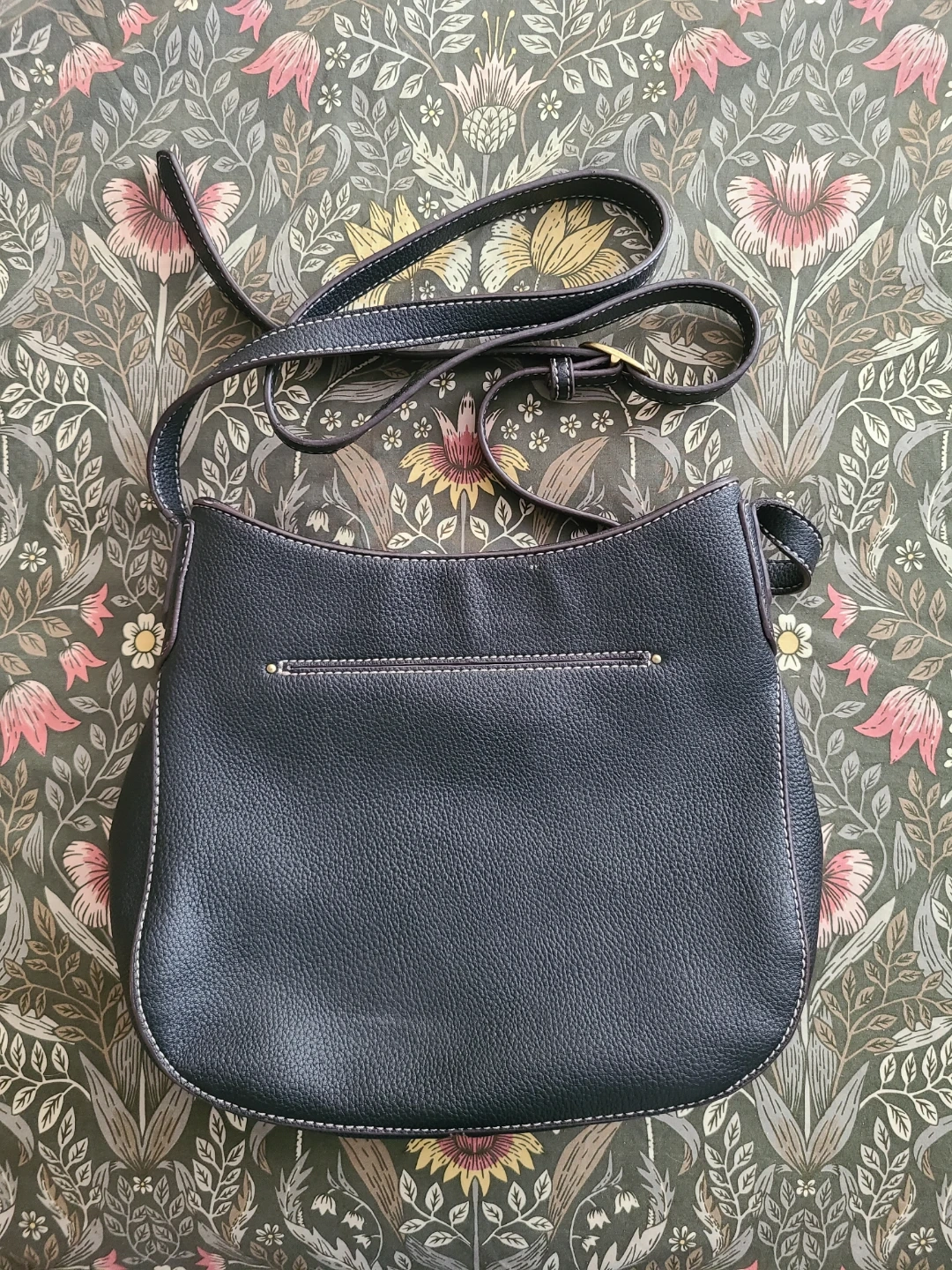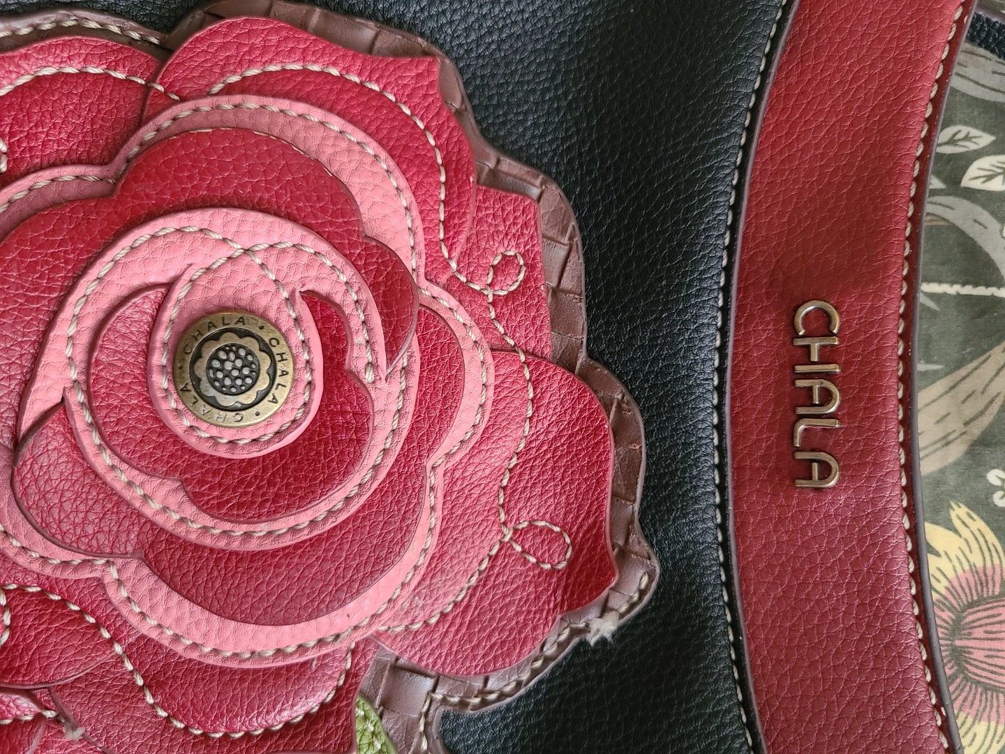 Chala black crossbody bag featuring a large pink and red rose appliqué on the front. It's made of faux leather with a patterned fabric lining. Includes an adjustable shoulder strap, 3 interior pockets, and an exterior back pocket.
