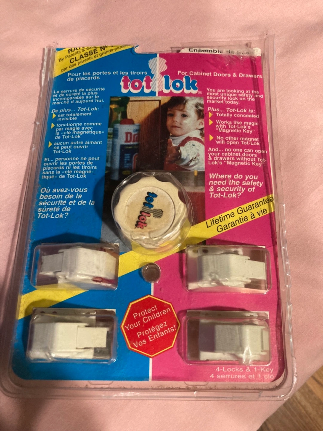 Set of 4 Tot-Lok magnetic cabinet locks and 1 key. The Tot-Lok system is the original magnetic lock that could be used to lock cabinet doors and drawers. Works like magic. Everything included. Originally costs $80(see pic #2)