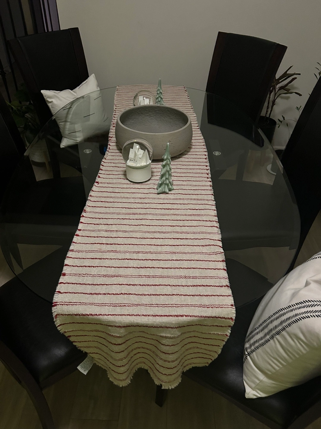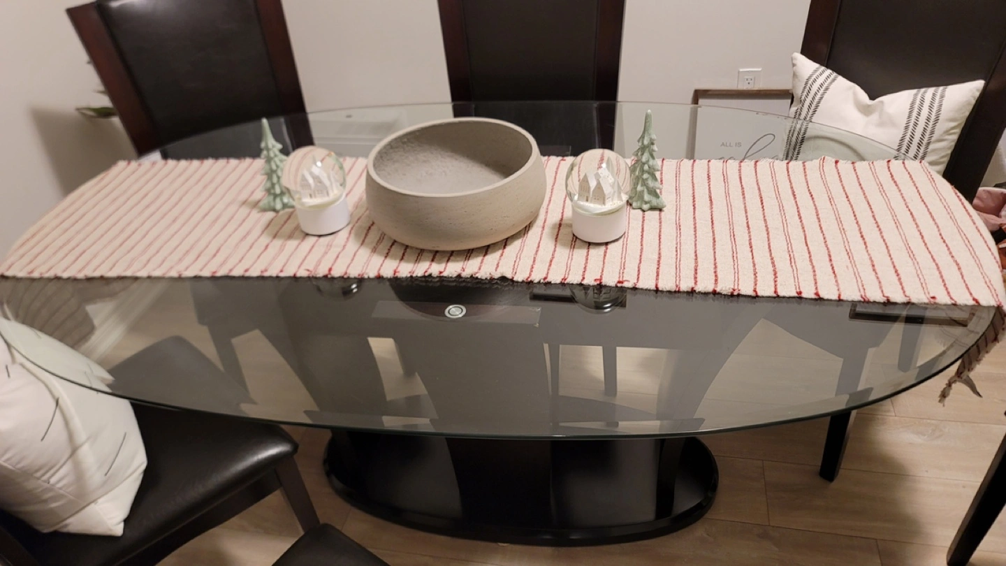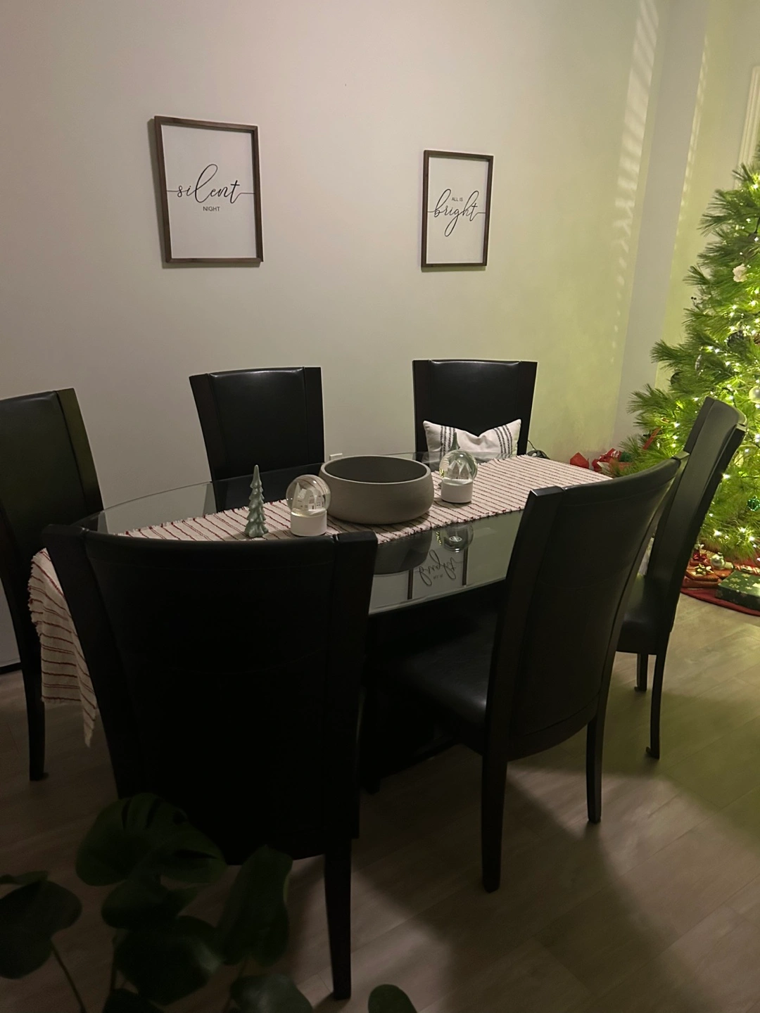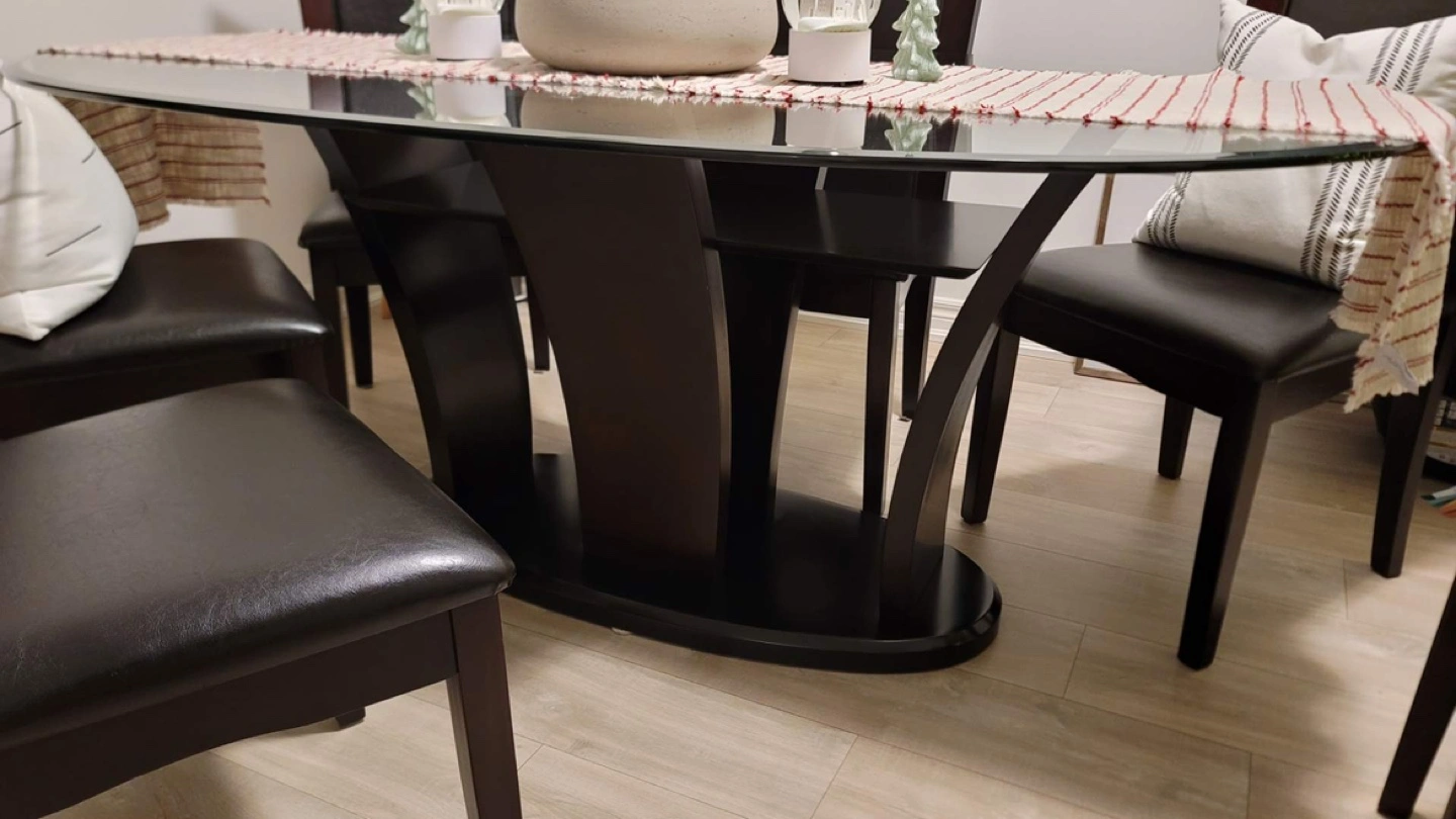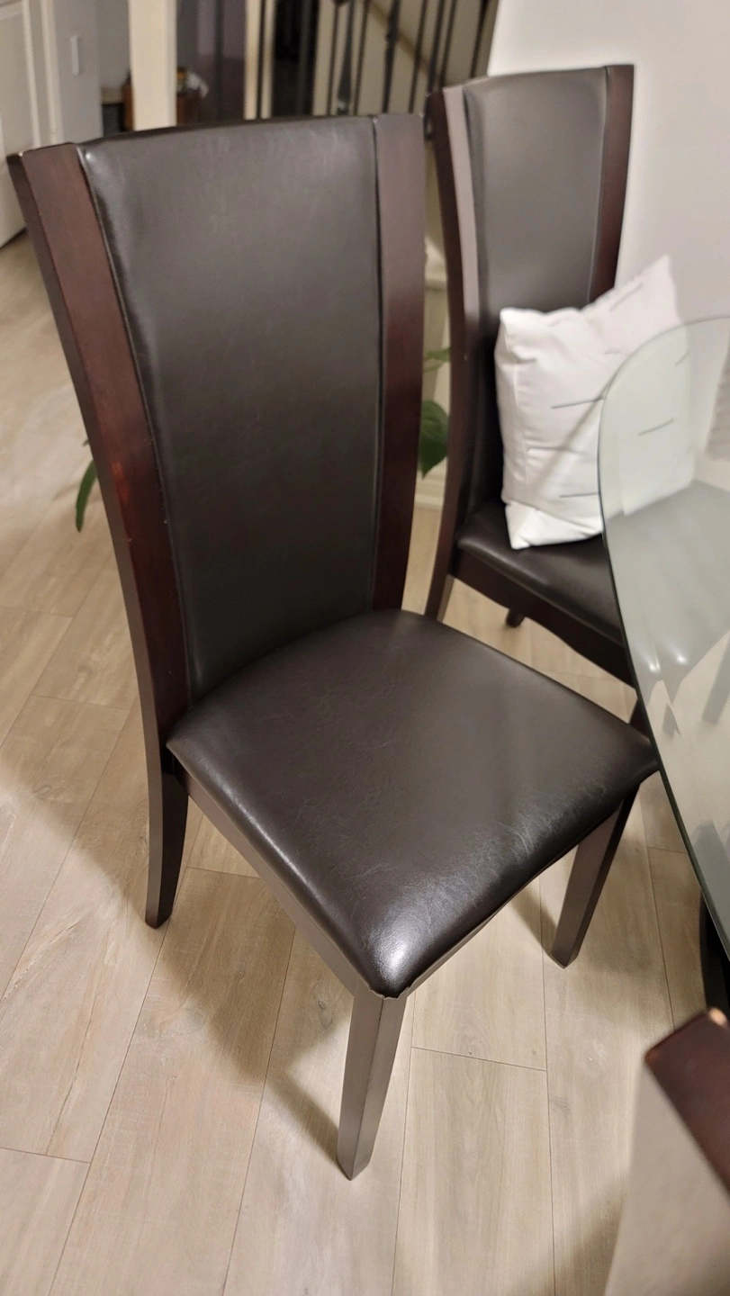 Oval glass top table with six dark brown leather chairs. Table is in good condition with some minor scratches. Chairs have minimal wear on the seats.
