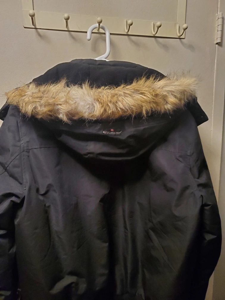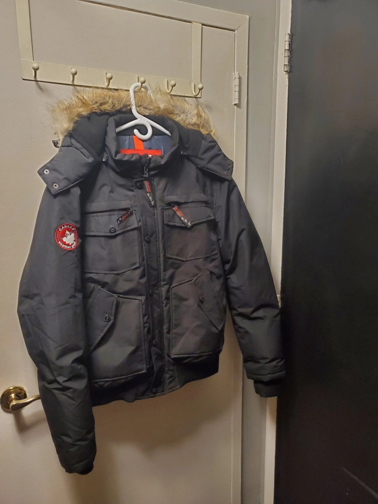 52Black winter jacket with a fur-lined hood. Has multiple pockets and a zipper closure. Size L. very warm Winter Jacket very good condition only cash price firm no delivery. I have more Winter Jackets Autumn Jackets and Rain jackets for Men's & Boys for sale all size. I have and app Kijjijji and app Facebook. Location Cawthra and Lakeshore Mississauga.