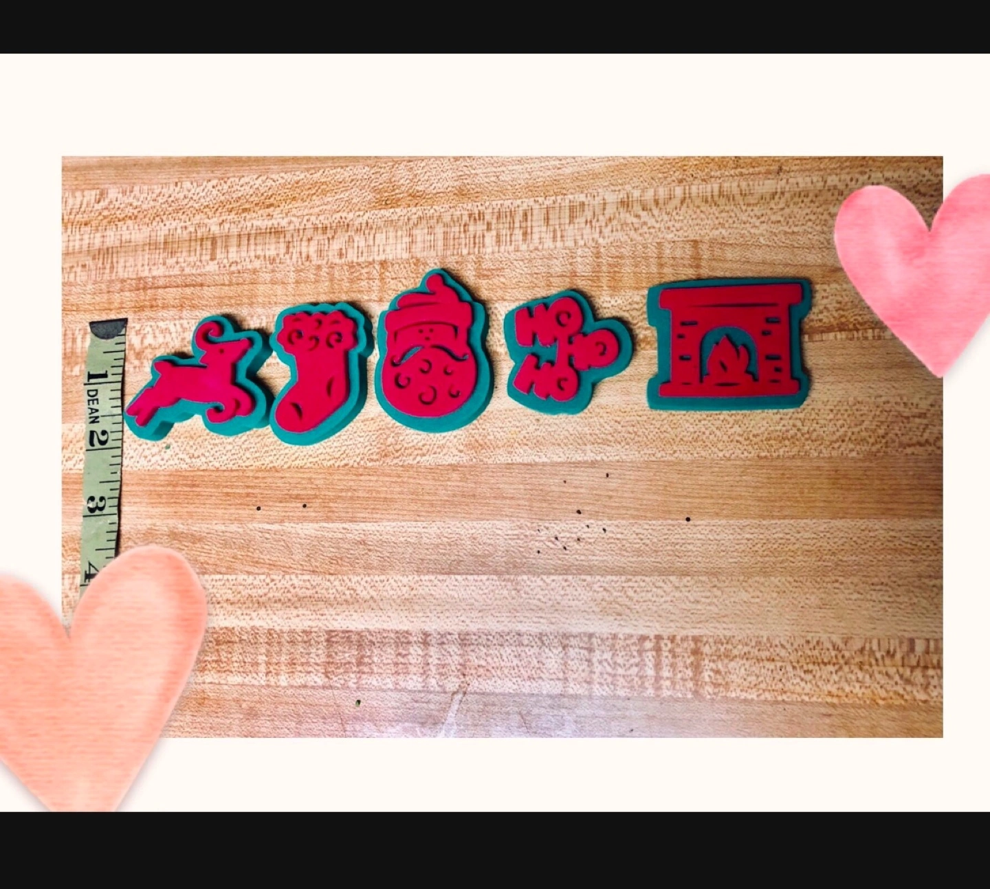 Set of 5 Christmas themed foam stamps. Includes reindeer, stocking, Santa, fireplace, and a "Ho Ho Ho" stamp.