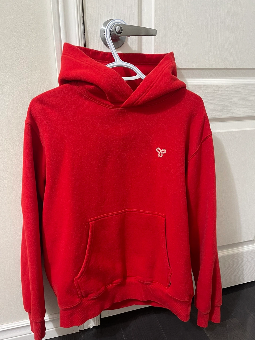 58Red hoodie with a small white logo on the chest. Has a front pouch pocket.
