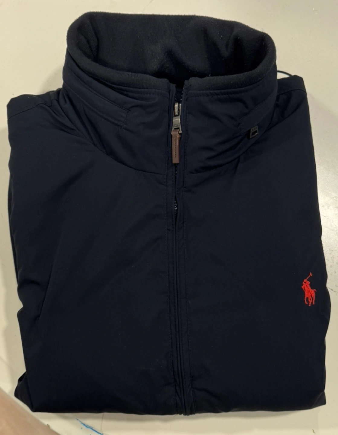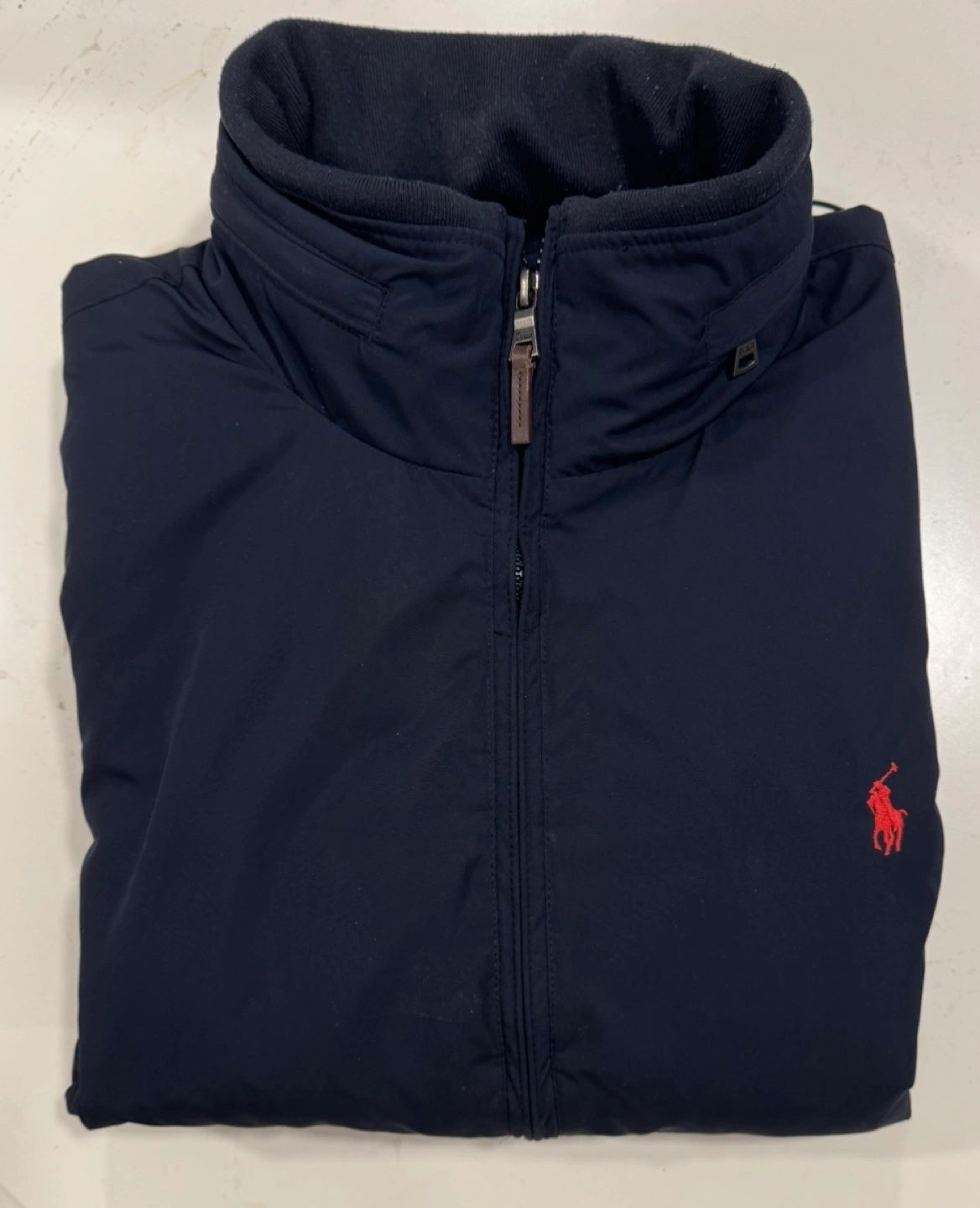 Men's black jacket with a zipper closure, a high collar, and a red polo player logo. Size XL.