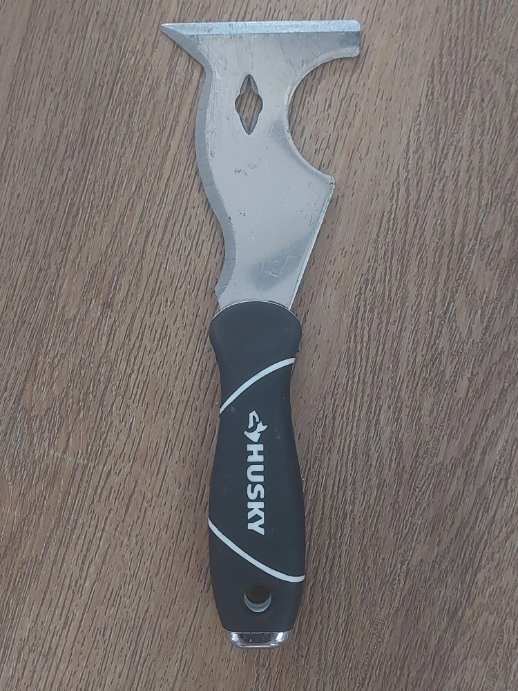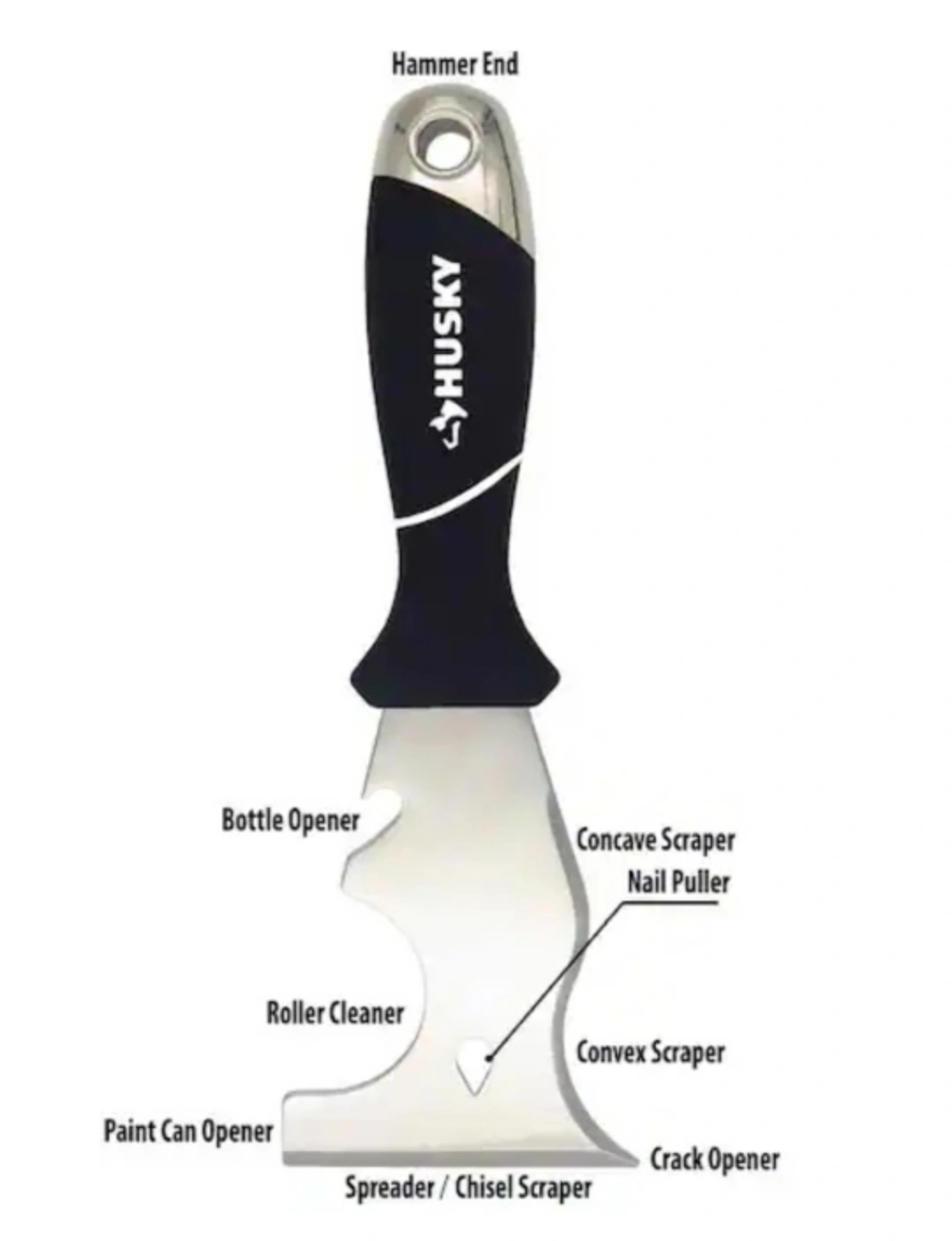 Multi-purpose tool with various features, including a hammer end, concave scraper, nail puller, bottle opener, roller cleaner, convex scraper, crack opener, paint can opener, and spreader/chisel scraper.