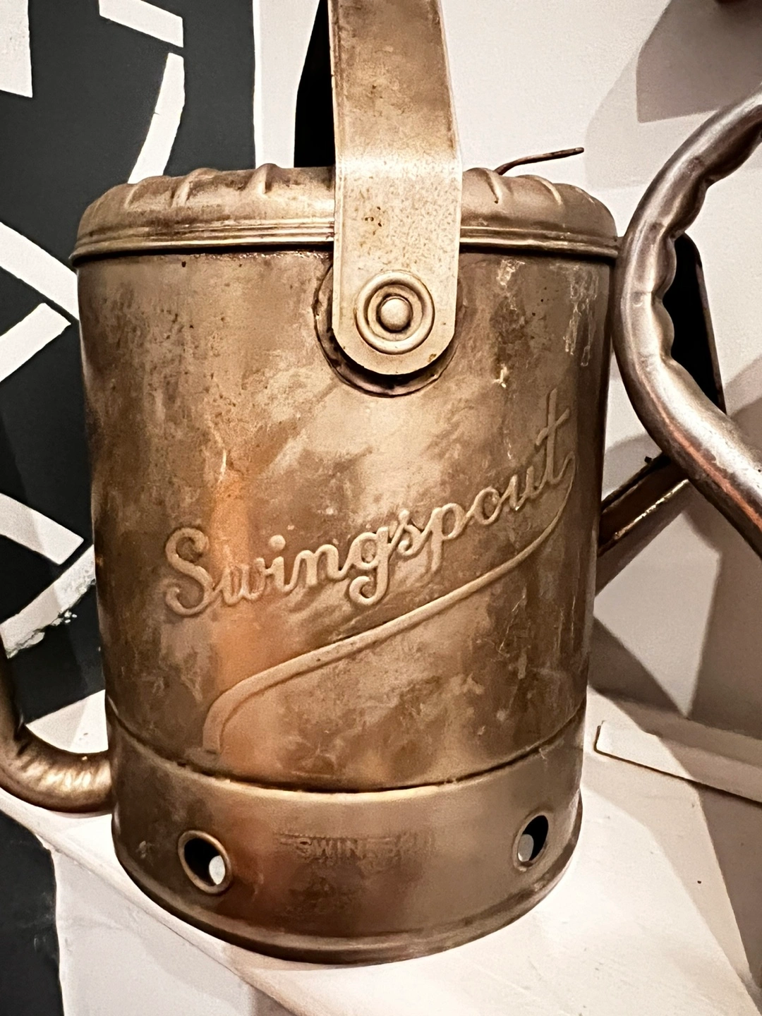 75Vintage metal watering can with a swing spout. Holds one gallon of liquid. Great vintage condition