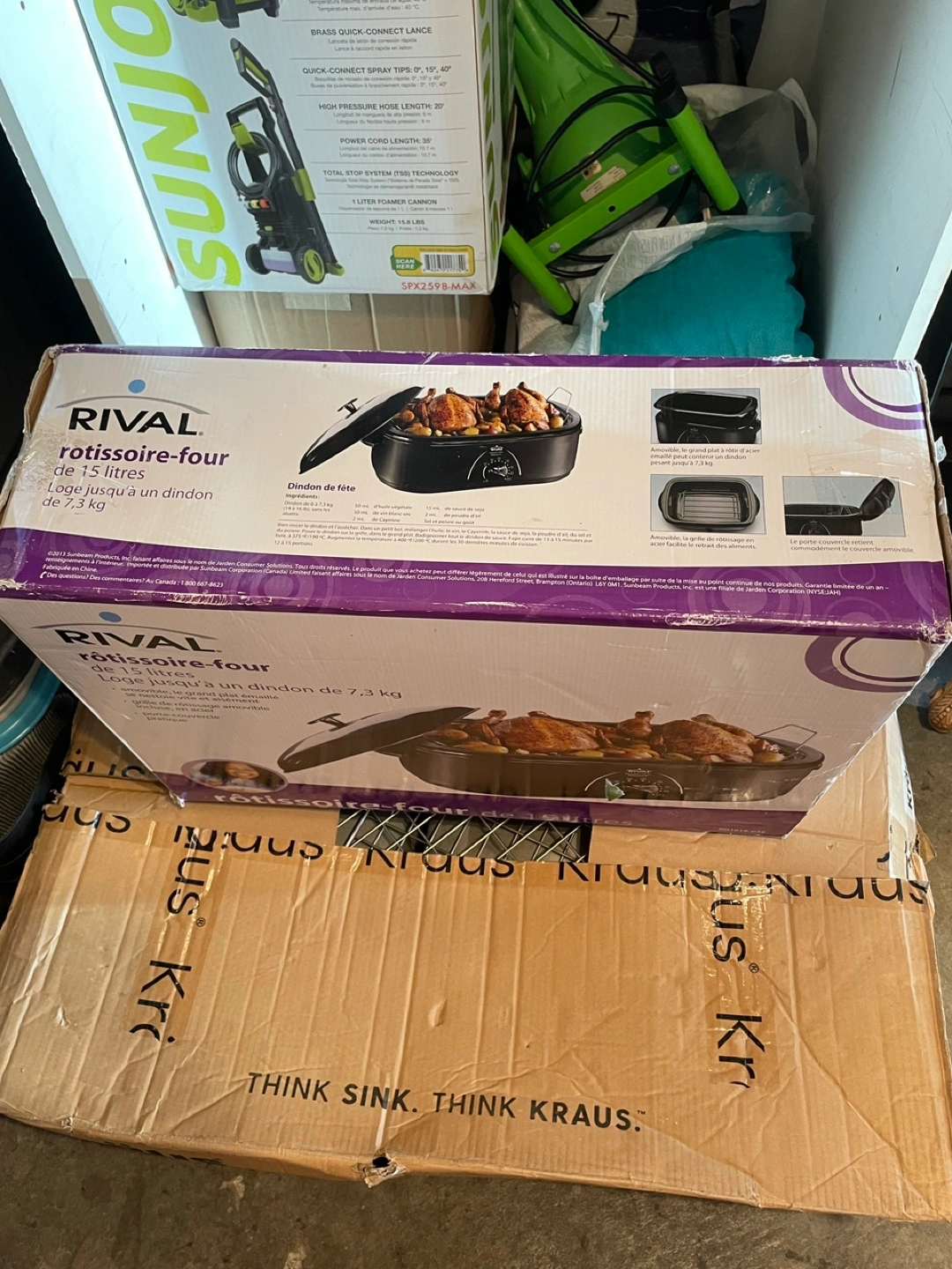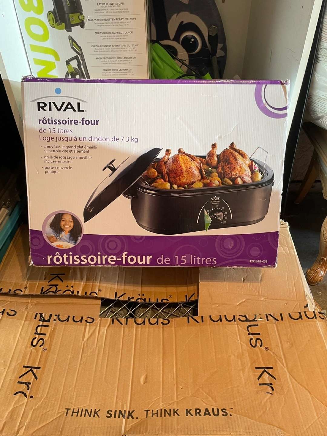 15 litre rotisserie oven. Holds up to a 7.3 kg turkey. Includes a removable enamel roasting pan, rotisserie spit, and a drip pan. Comes with a lid and a rack.