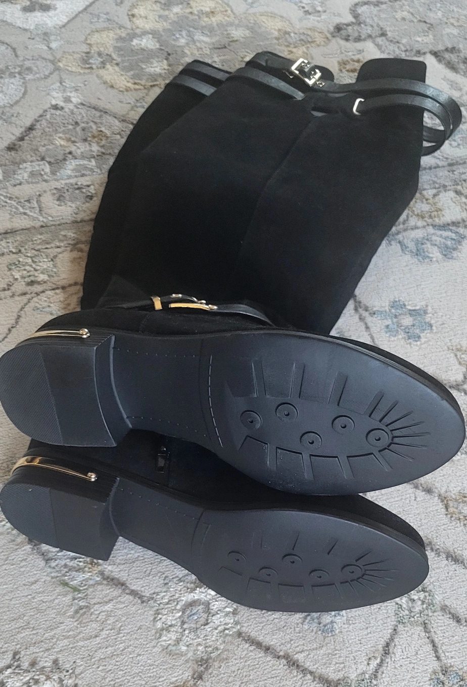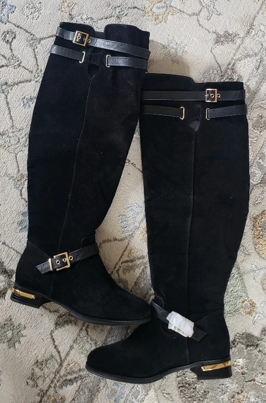 Black suede knee-high boots with gold buckles. Fits over the knees. Low block heel and a side zipper for easy on and off.