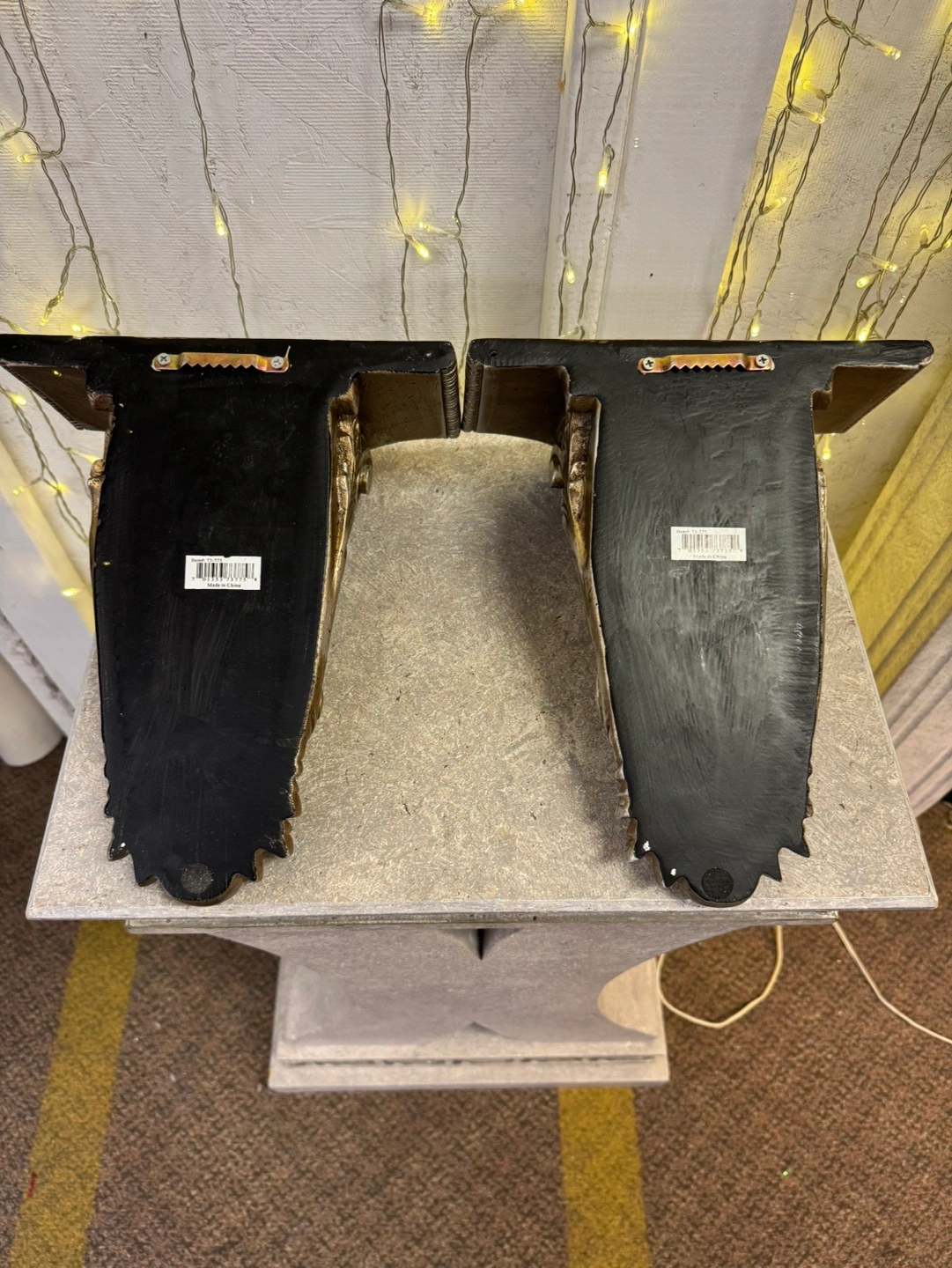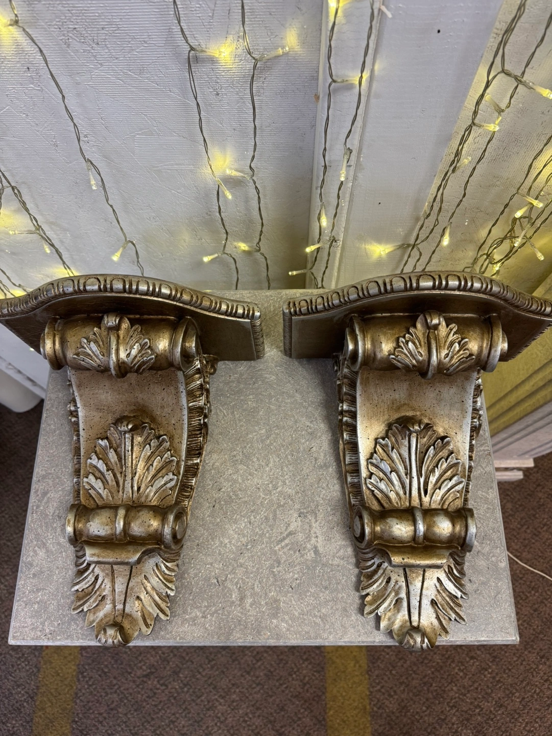 Set of two ornate wall shelves, gold finish. Perfect for displaying décor or small items. High 32cm,Wide 25cm