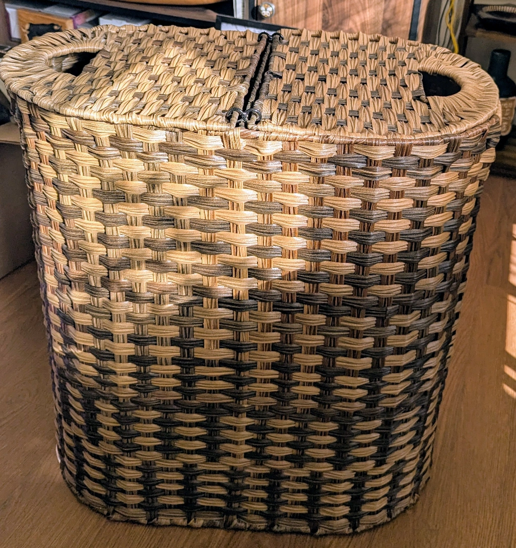 Large wicker laundry basket with two handles and 2 lids, 2 colors Brown and tan woven design. excellent condition. Comes with 2 cotton bags.