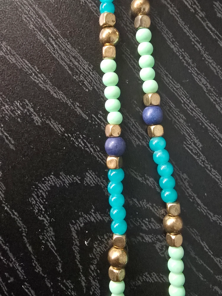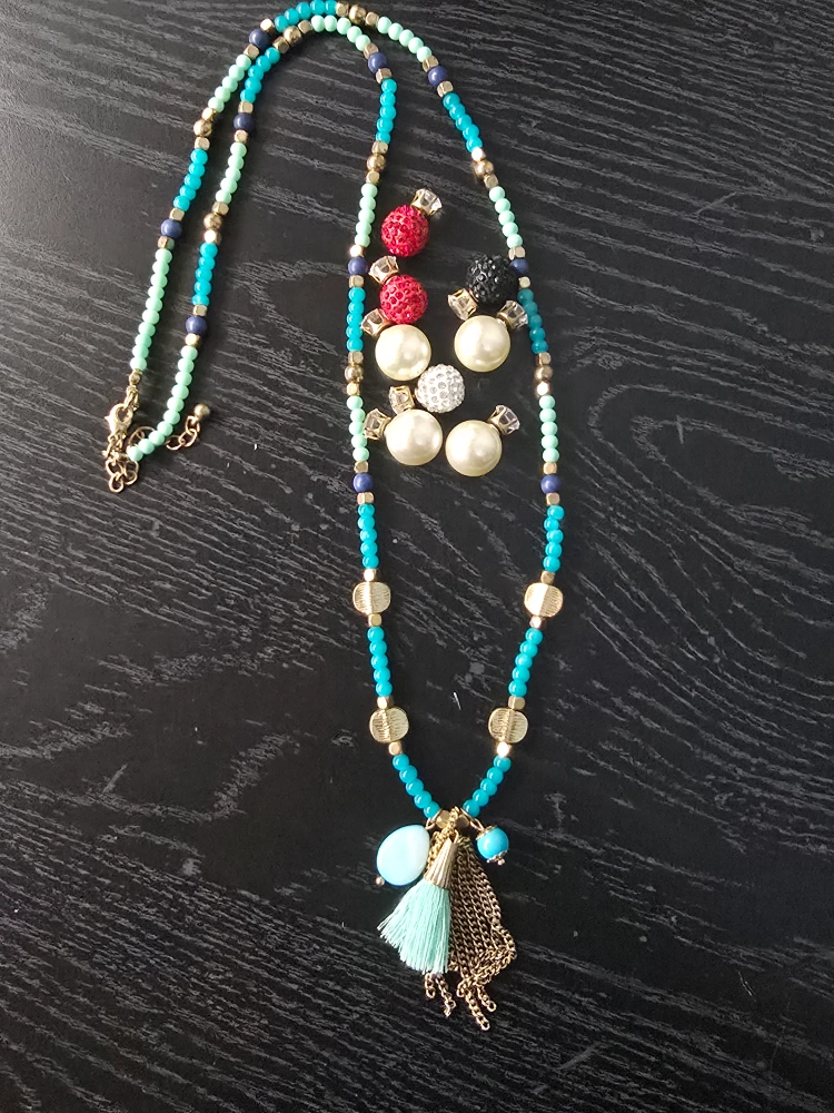 Turquoise beaded necklace with a tassel and four pairs of earrings. Price negotiable & open to trades. Delivery possible to most line 1 and line 2 stations.