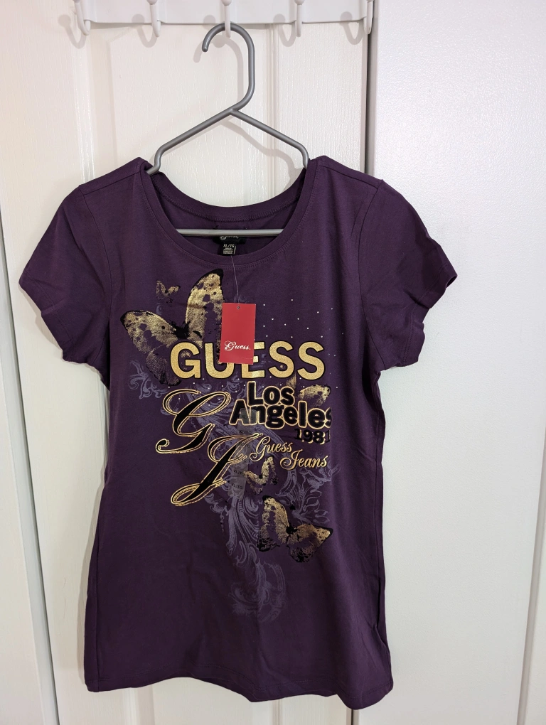 213Purple T-shirt with gold print of the Guess logo, butterflies and the words 'Los Angeles 1981 Guess Jeans'.