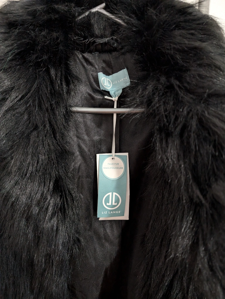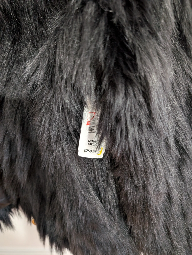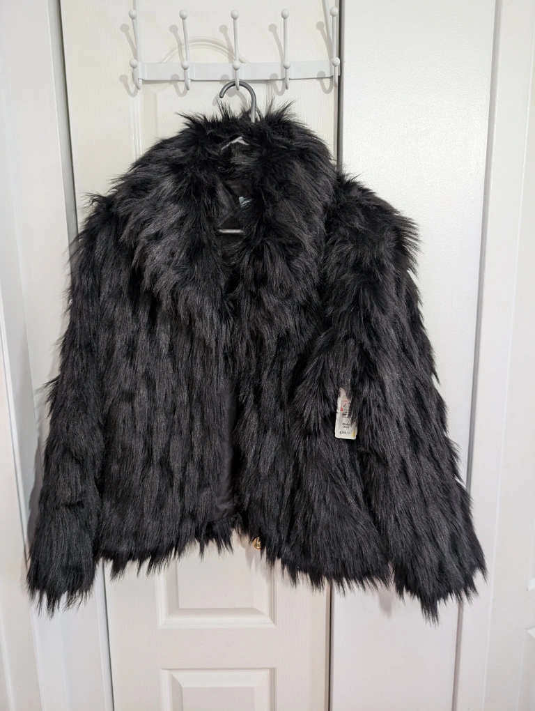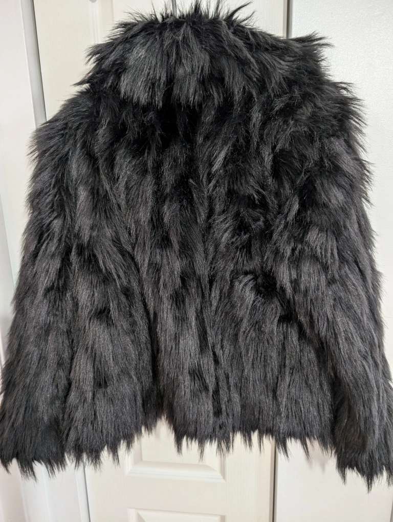 213Black faux fur jacket. Size: Large. Has a large collar and is cropped.
