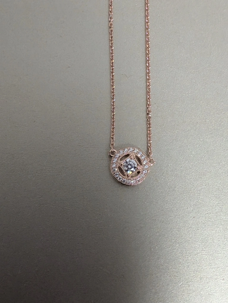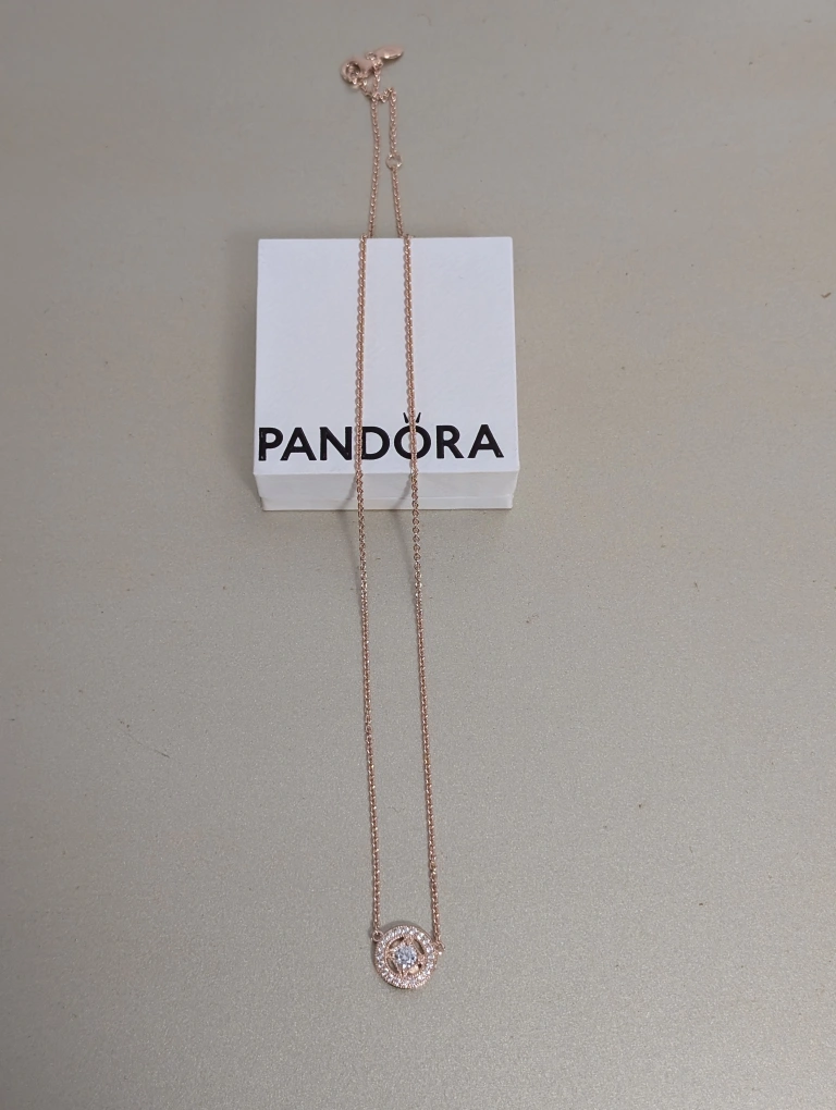 213Rose gold necklace with a clear stone centre in an oval shape surrounded by smaller stones. Comes with the original Pandora box.