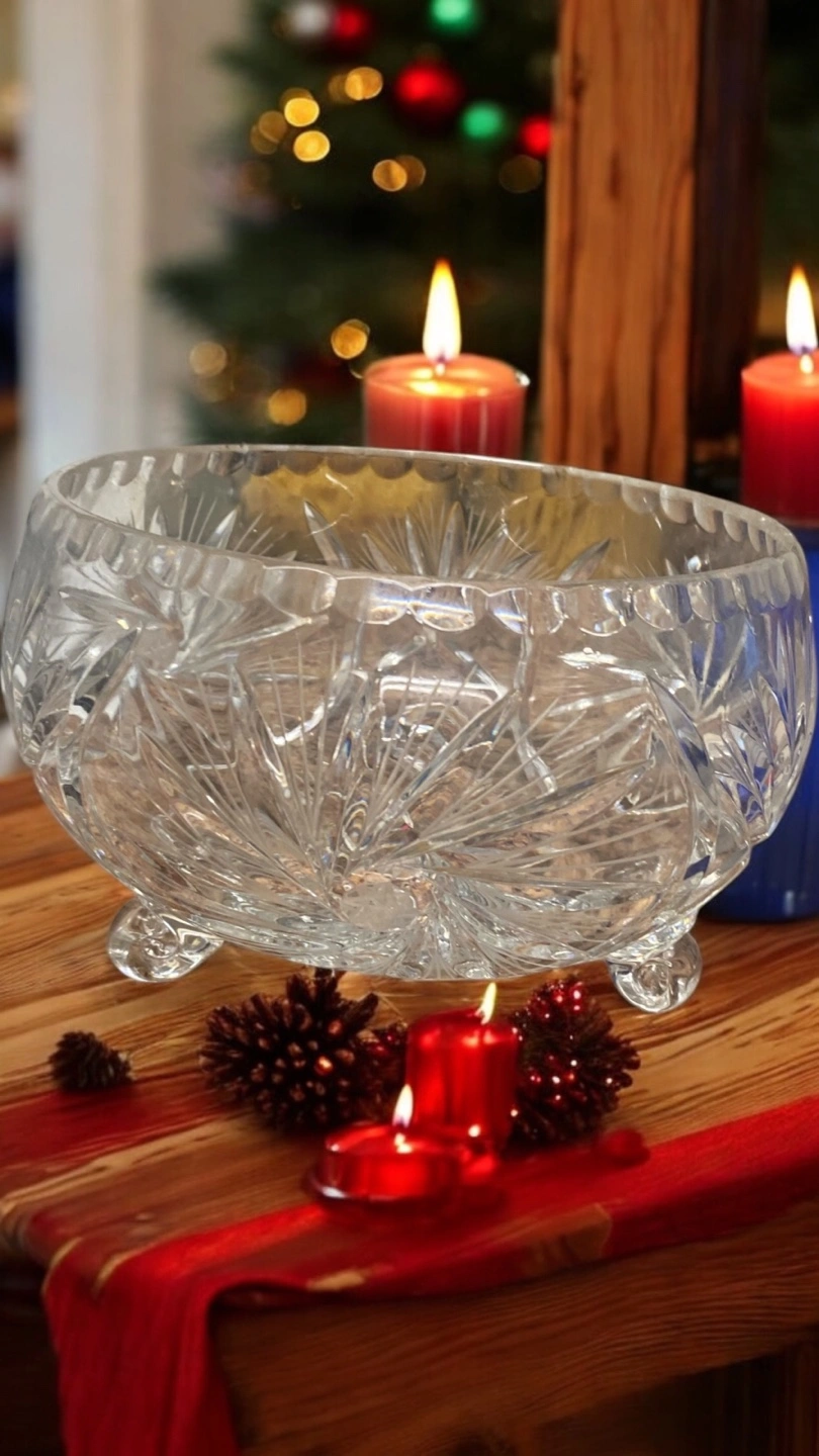 Large crystal serving bowl with a cut design, three feet, and a wide opening.